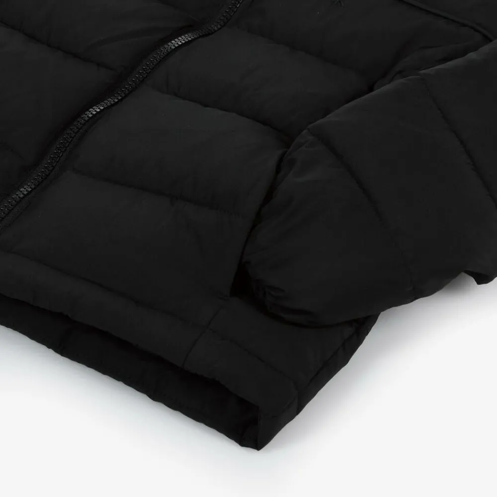 Black belted puffer jacket for girls by Calvin Klein, made in silky smooth fabric with mid-weight padding. Ensuring warmth during the colder months, this slim-fit design has a full zip front and long sleeves with elasticated cuffs. The stand-up collar is lined with cosy polar fleece and the silky interior is printed with a Calvin Klein Jeans logo. To shape the waist, the elasticated belt is fully adjustable and fastens with a branded clip buckle. A monogram logo, in tonal embroidery, adds further designer detail to the chest. The outer material and lining are made with at least 95% certified recycled material.