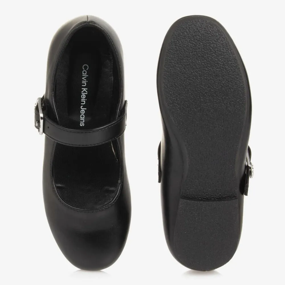 Black faux leather pumps for girls by Calvin Klein. In a classic Mary Jane style, they have a buckle fastening strap and a comfortable low heel. Lined in smooth faux leather, they have a softly padded insole and a rubberised sole for good grip. Adding a subtle designer touch, the brand's iconic CK monogram is visible on the silver buckle.
