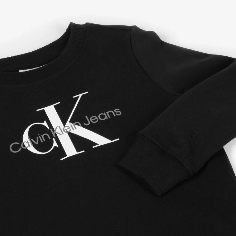 Casual black cotton sweatshirt for boys and girls by Calvin Klein, made in soft mid-weight jersey. For instant brand appeal, it has a monogram logo print across the front in white and grey.