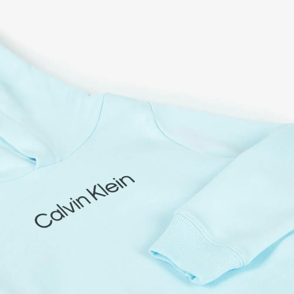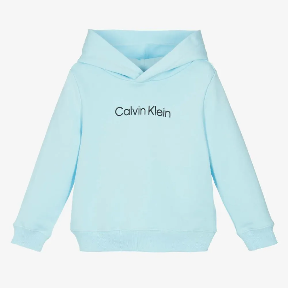Casual light blue hooded sweatshirt for boys and girls from Calvin Klein. It is made in comfortable, mid-weight cotton jersey with a black logo print across the front for instant branded appeal.