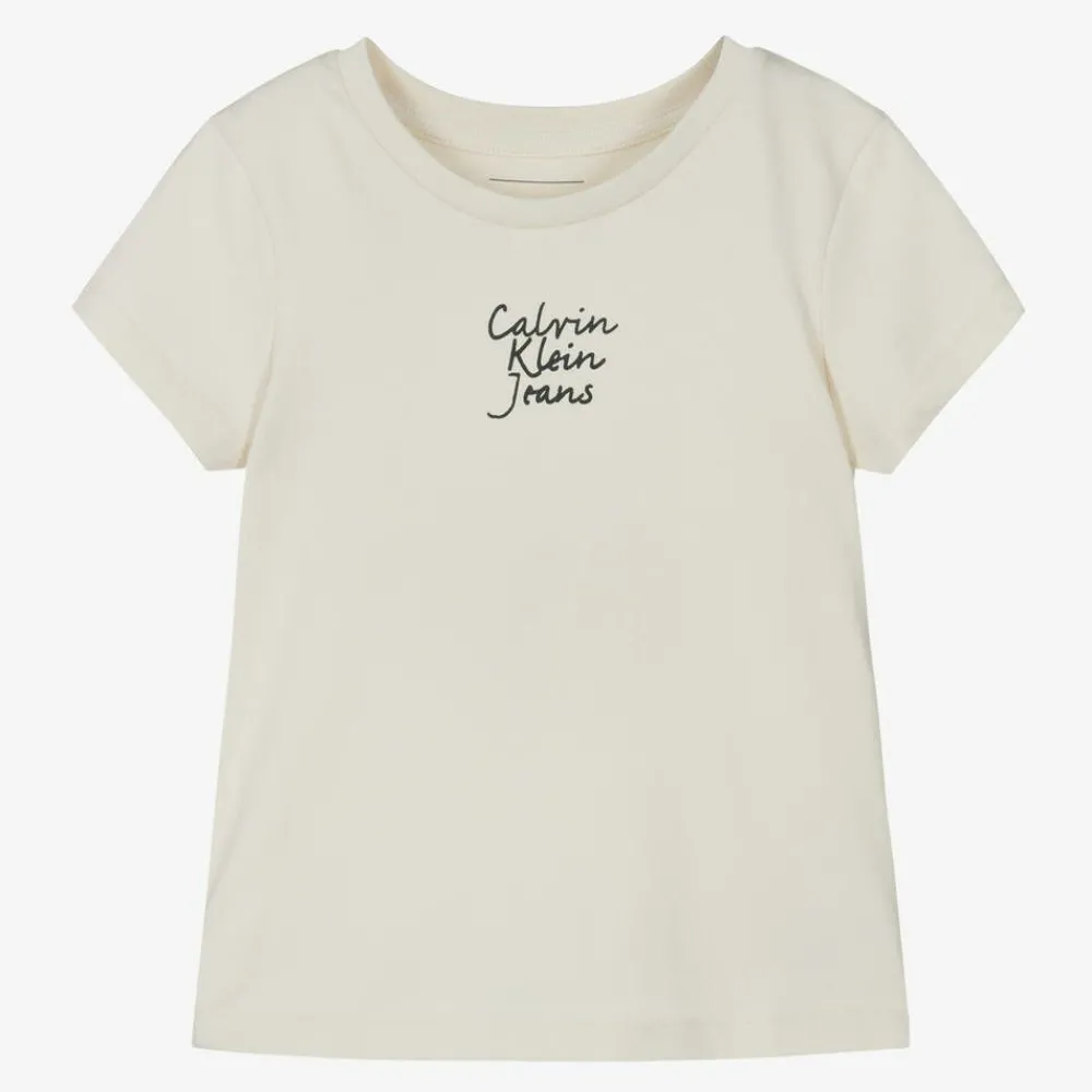 Pale beige organic cotton T-shirt for girls by Calvin Klein. Made in comfortable jersey, this casual tee has a black script logo printed on the front.