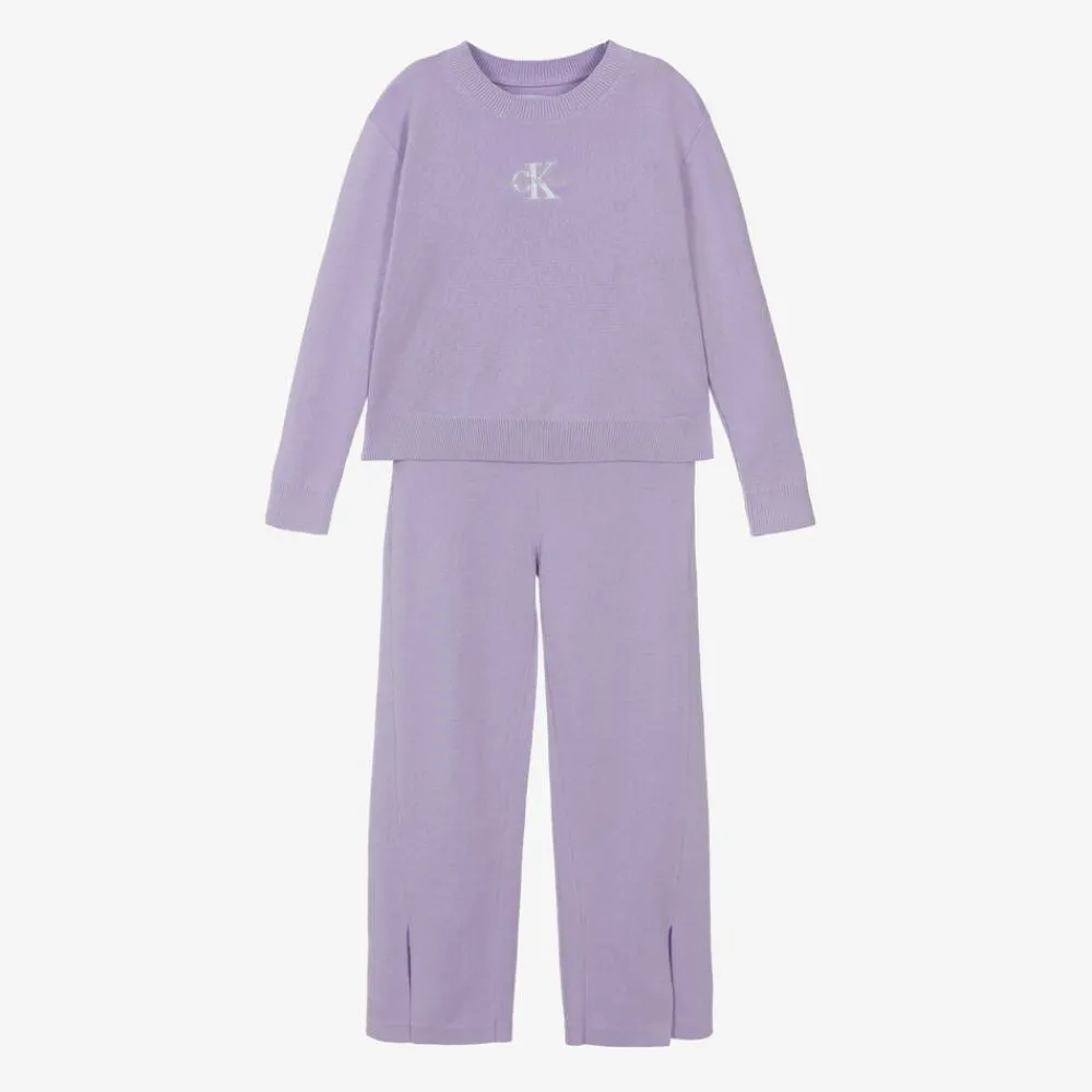 Lilac purple tracksuit for girls by American brand Calvin Klein, knitted from organic cotton for extra softness and comfort. Styled with ribbed knit trims, the long-sleeved sweater is embroidered with a Calvin Klein Jeans logo on the front for a branded look. The matching trousers have a ribbed waistband and stylish split detailing on the ankles.