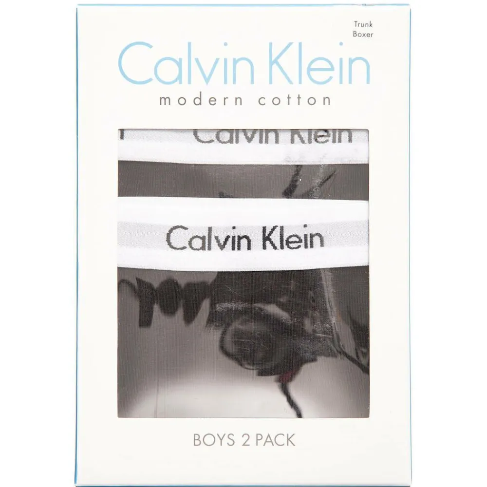 Calvin Klein, pack of two black boxer shorts for boys. Made with soft, stretchy cotton jersey and both have an elasticated waistband featuring the designer's name.