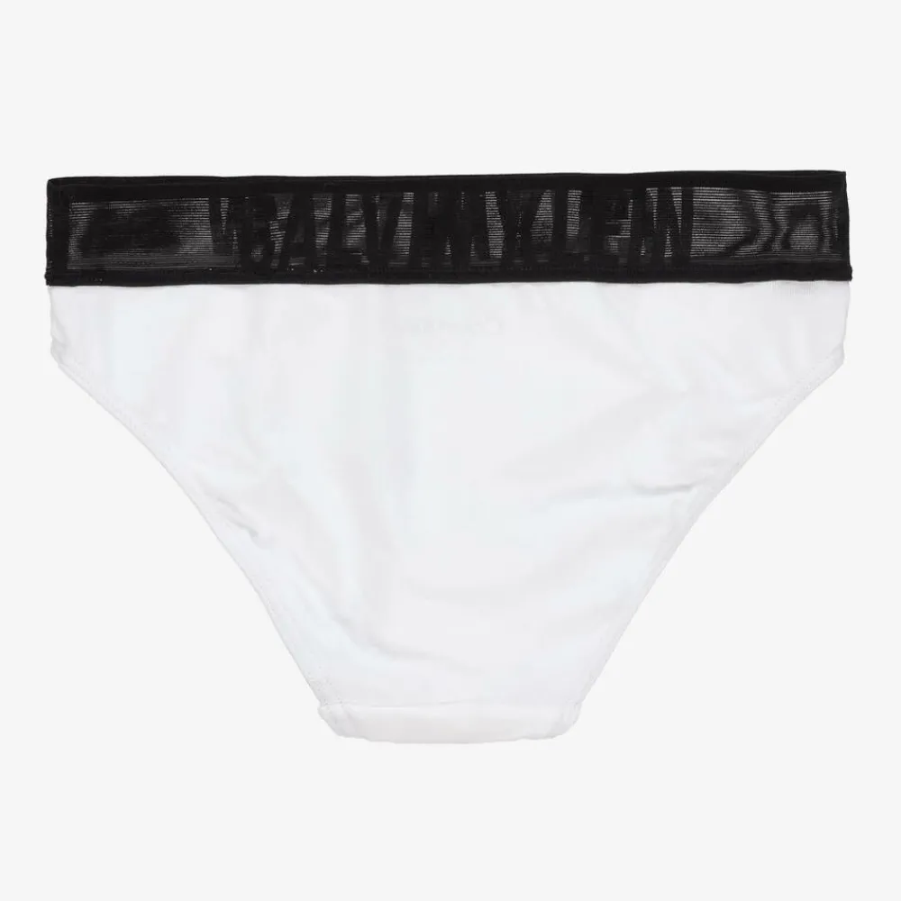 A two-pack pair of bikini-style knickers for girls by American brand Calvin Klein, one in black and the other in white. Made in comfortable cotton jersey, each has a sheer black elasticated logo waistband.