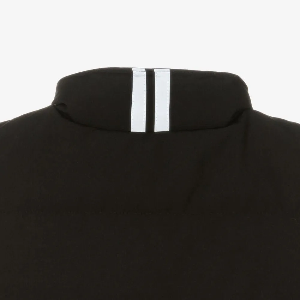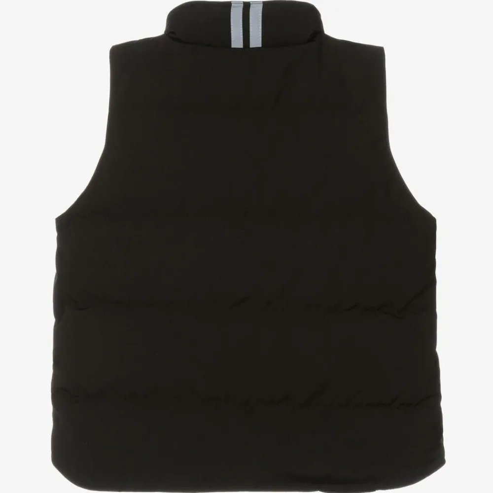 Black gilet for boys and girls by luxury designer Canada Goose, with the iconic disc logo on the chest. Ideal for layering, this durable gilet is made from water-repellent, recycled, organic ARCTIC TECH fabric with luxurious down padding. The hem is longer at the back for protective coverage and there are reflective stripes on the back of the padded collar for low-light visibility. The two fleece-lined popper pockets on the front are designed to warm hands and the front zip fastening is concealed under a popper-fastening placket to shield your child from the elements.