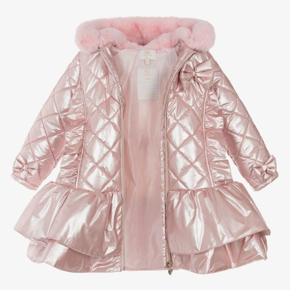 A striking pink metallic coat for girls by Caramelo Kids. Smooth with a silky lining, this quilted coat has a layered peplum hemline and adorable bow appliqués. The hood has a cosy soft faux fur lining and trim for extra warmth. Fastening with a gold zip on the front, there are frills at the sides, useful popper-fastened pockets, internal ribbed cuffs on the sleeves and a partially elasticated waistband for shape.