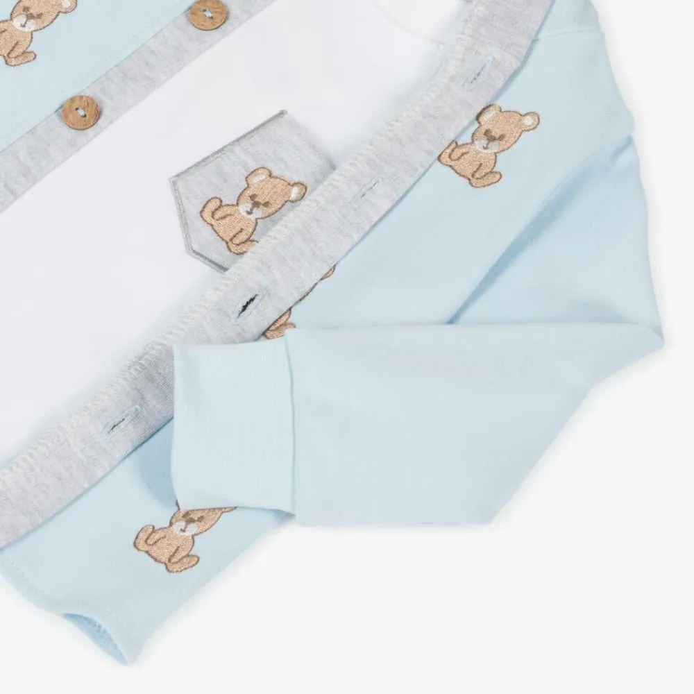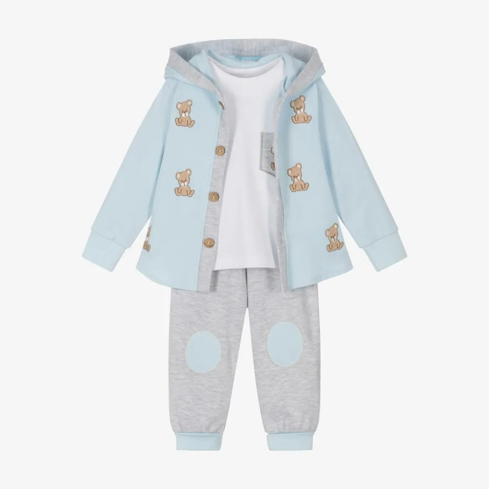 A blue and grey marl tracksuit set for little boys by Caramelo Kids, made from comfortable cotton jersey. The hooded top, embroidered with cute beige teddy bears, fastens on the front with wooden buttons. Long-sleeved, the white top has a ribbed neckline and a decorative pocket on the chest with a matching motif. The paired joggers have an elasticated waistband and sweet blue panels on the knee.