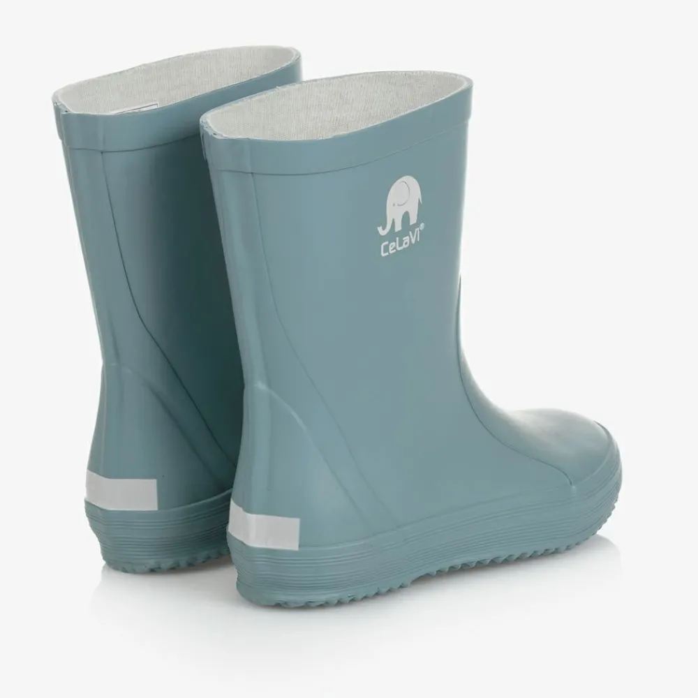 Boys and girls blue waterproof rain boots from Danish brand CeLaVi, handmade with flexible natural rubber. They are fabric-lined for comfort, with a fabric inner sole and non-slip rubber outer sole. There are reflective details on the heel and side for added safety.