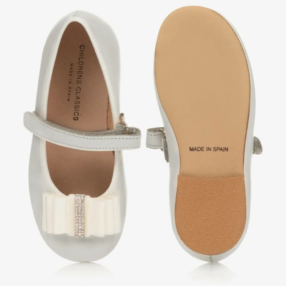 Pale grey leather shoes for girls from Children's Classics, exclusive to Childrensalon. These pretty ballerina pumps have a grosgrain ribbon bow with diamanté across the toes adding a touch of sparkle. Easy to wear, they fasten with a velcro strap and are fully lined in supple leather, with a non-slip sole.