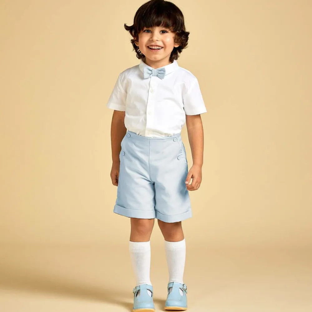 Exclusive to Childrensalon, a pair of traditional pair of pale blue T-bar style shoes for boys and girls by Children's Classics. They are made in lovely soft leather with exposed stitching details and fasten easily with silver buckles.