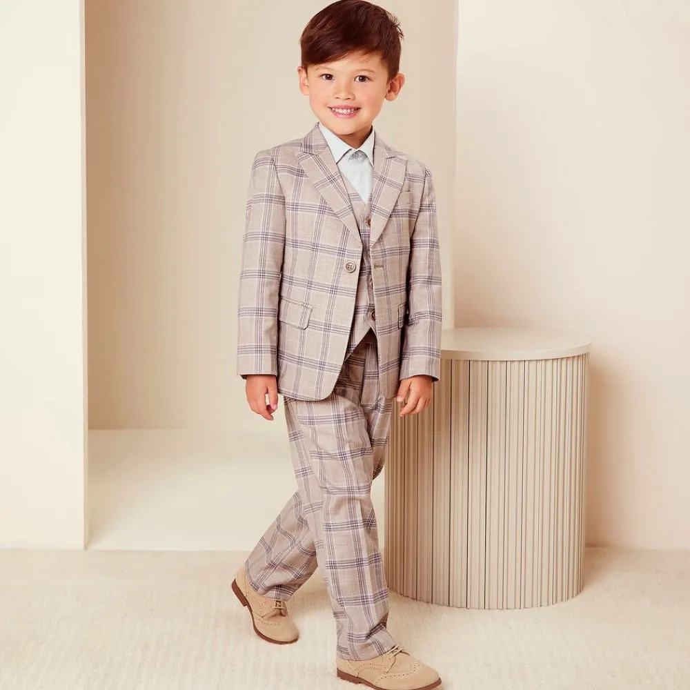 Exclusive to Childrensalon, a pair of beige suede brogues for boys by Children's Classics. These smart shoes have traditional cut-out detailing and lace-up fastening. They have a small heel, a non-slip rubber sole and are leather lined.