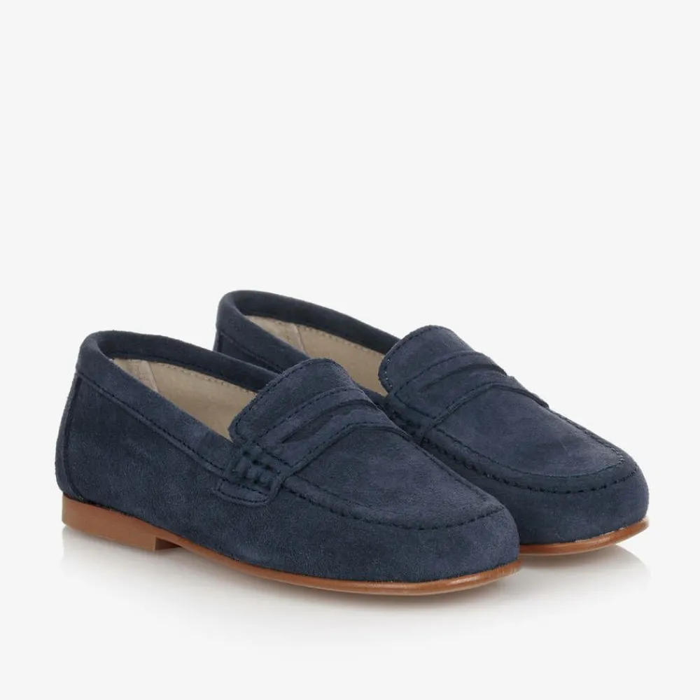 Exclusive to Childrensalon, boys blue suede leather shoes from Children's Classics, in a classic loafer style. These slip-on shoes have soft leather lining with a cushioned insole and a sturdy, non-slip rubber sole.
