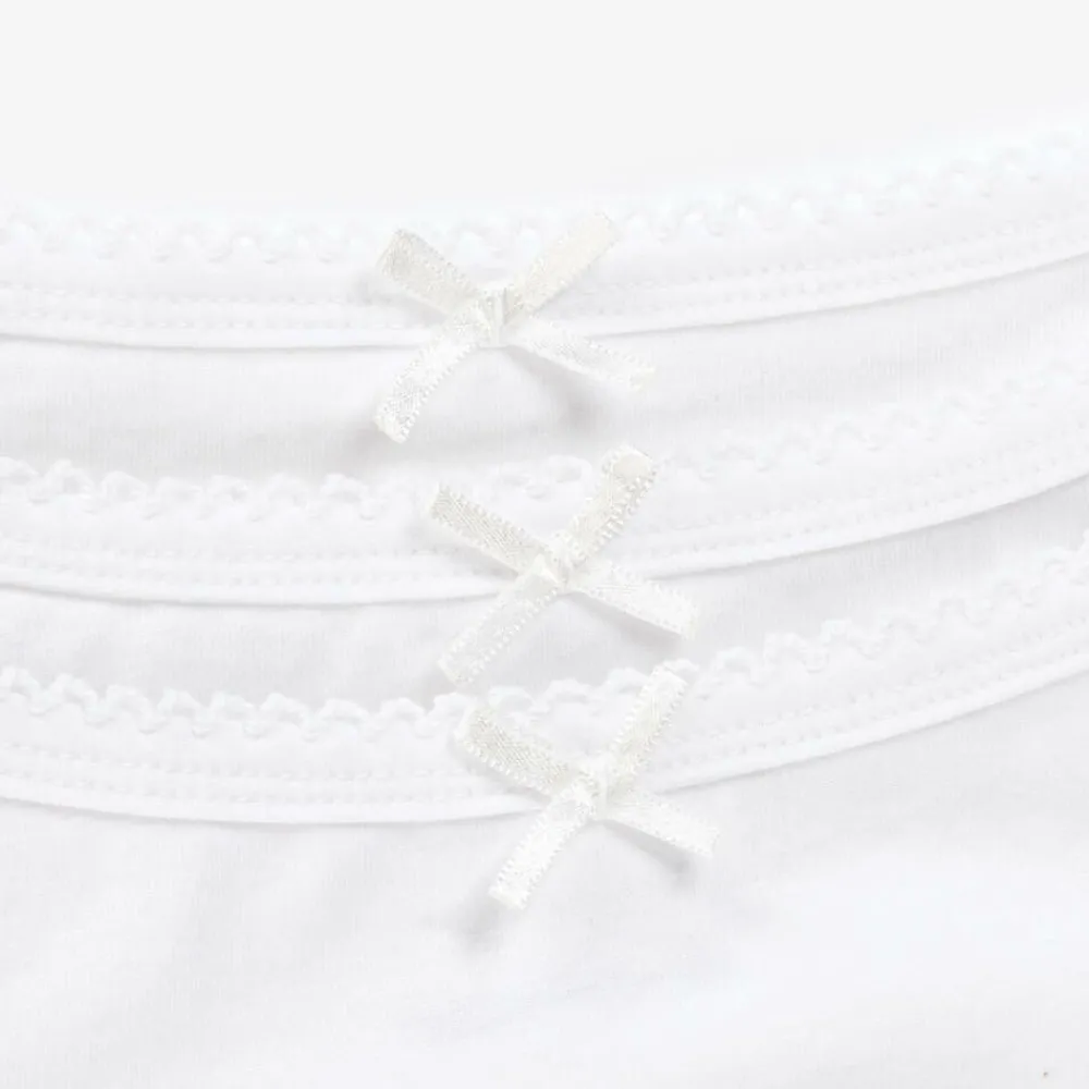 Pack of three organic cotton vests for girls by Childrensalon Essentials. Made in soft, comfortable jersey, they have a sweet picot trim and a small satin ribbon bow on the front. There are narrow shoulder straps and a gently elasticated hemline for a neat fit.