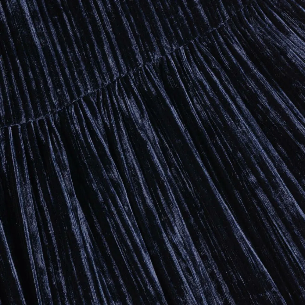 Demure, elegant navy blue dress for special events by Childrensalon Occasions. Made in soft, pleated velour with a sheen, it is ruffled on the front, with sheer lace detailing on the sleeves. Styled with a stand-up collar, it has a gathered, drop-waisted skirt.