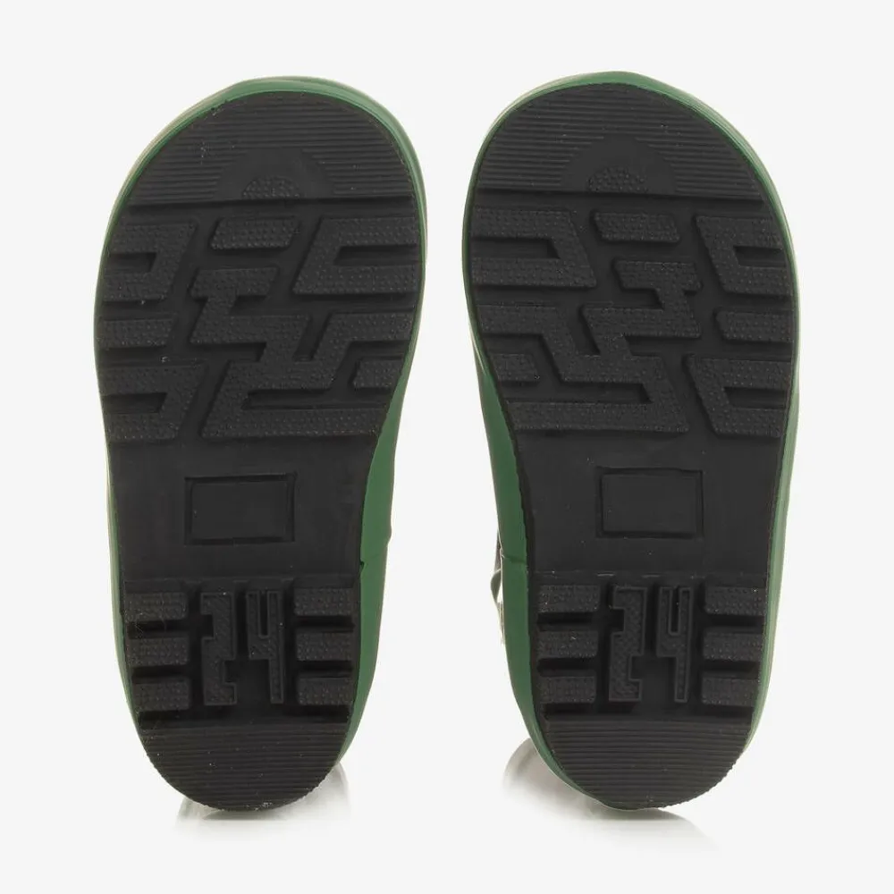 White and green rain boots for boys and girls by Chipmunks, made in smooth, flexible rubber. Lined with cosy fleece, these fun boots have a distressed-effect football design in black. Smaller sizes have useful handles to help pull them on easily.