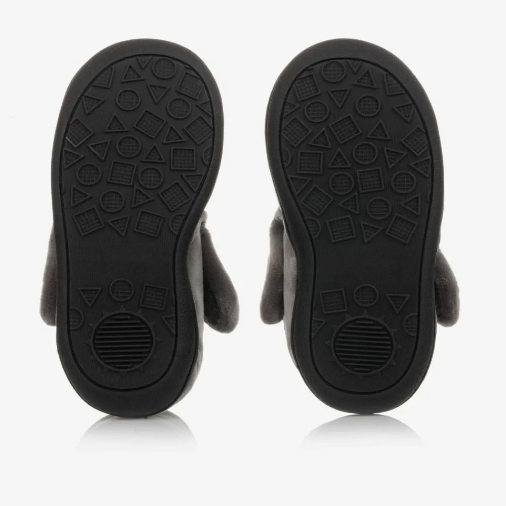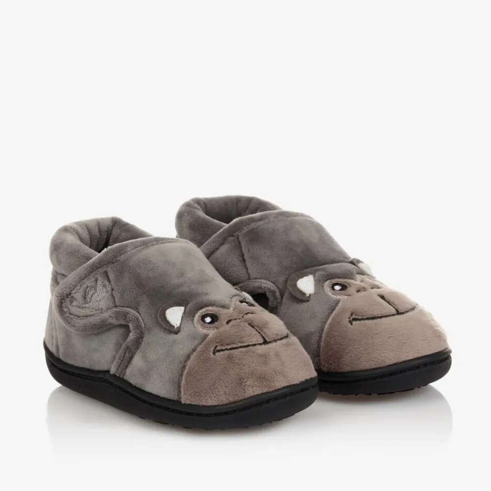 Boys grey Bubbles Gorilla slippers from Chipmunks, with an embroidered face and white ears on the front. They are made in plush velour-feel fabric, with a padded memory foam inner sole. They have a non-slip rubber outer sole and fasten with a velcro strap on the side.