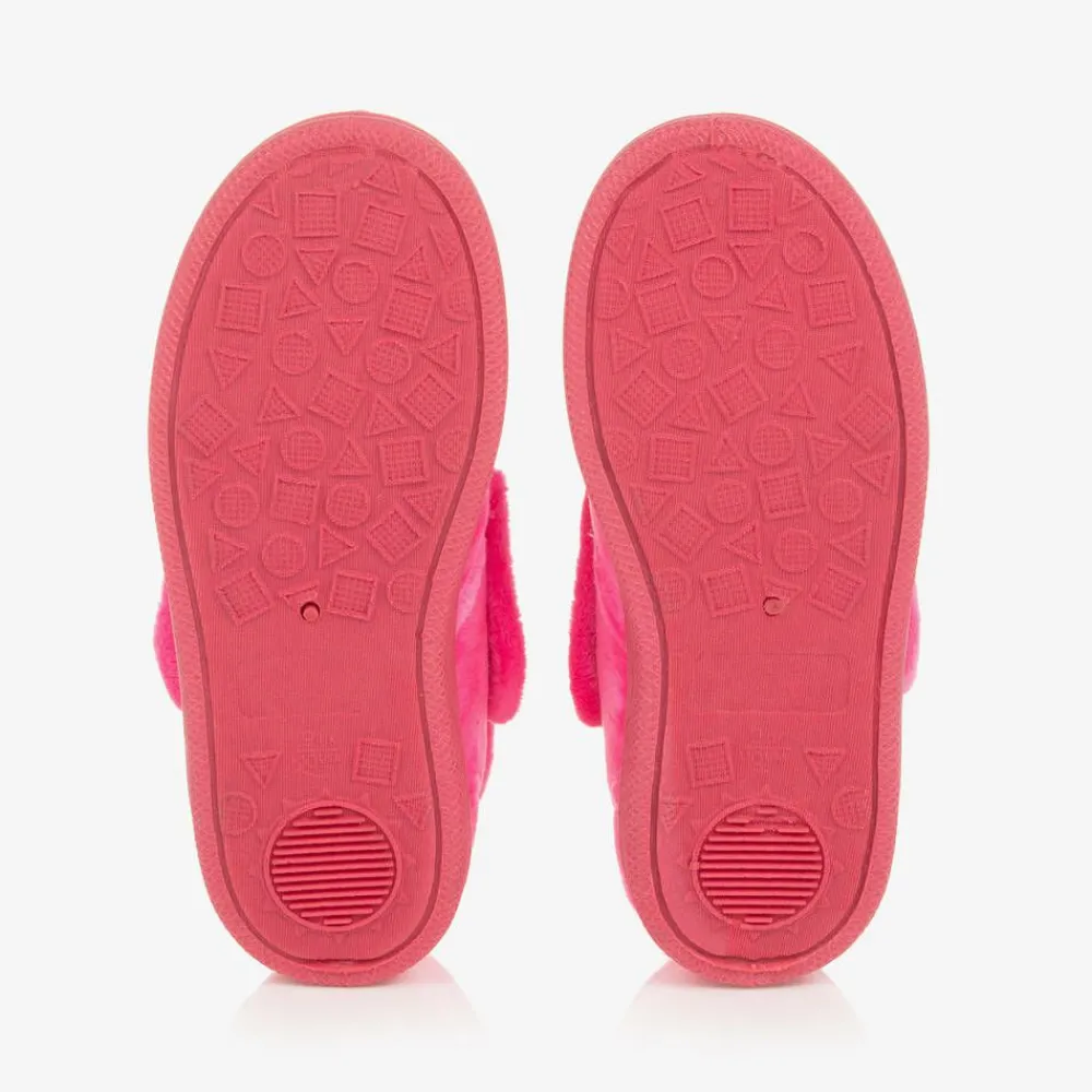 Neon pink slippers for girls by Chipmunks, made and lined in plush fleece for cosiness. Cute and fun, they have a dinosaur design with 3D spines embroidered on the front. The padded insoles provide support, the velcro panels make the shoes easy to put on, and the rubberised soles are flexible and treaded for safety.