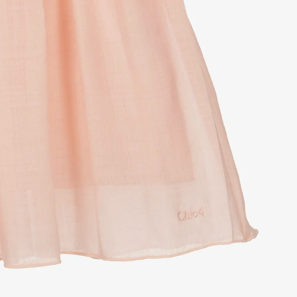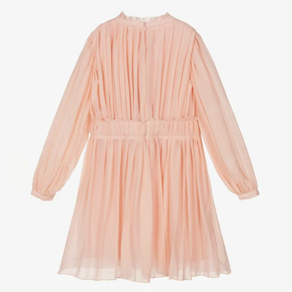 Smart pleated pink Mini-me dress for girls by luxury French designer Chloé, made in very lightweight wool with a subtle, embroidered logo by the hemline. It has a frilly, frayed, stand-up collar, a coordinating waistband and full, semi-sheer sleeves. Fully lined in lightweight twill for comfort, it has a neat, concealed zip fastening on the back.