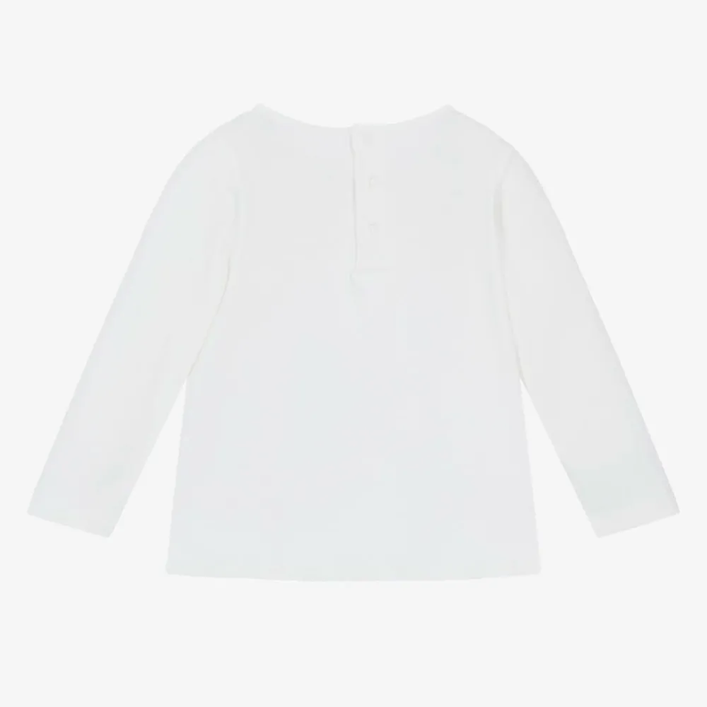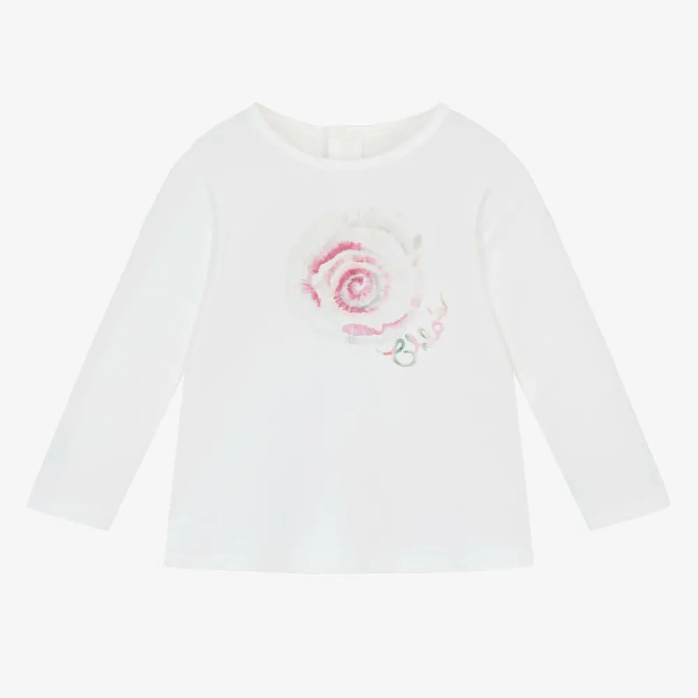 Lovely white long-sleeved top for younger girls by luxury fashion house Chloé, made in soft organic cotton jersey. A pretty watercolour spiral print can be seen on the front, with an embroidered logo below in complementary pastel shades. Ideal for comfortable, casual wear, it fastens with poppers on the back for easy dressing.