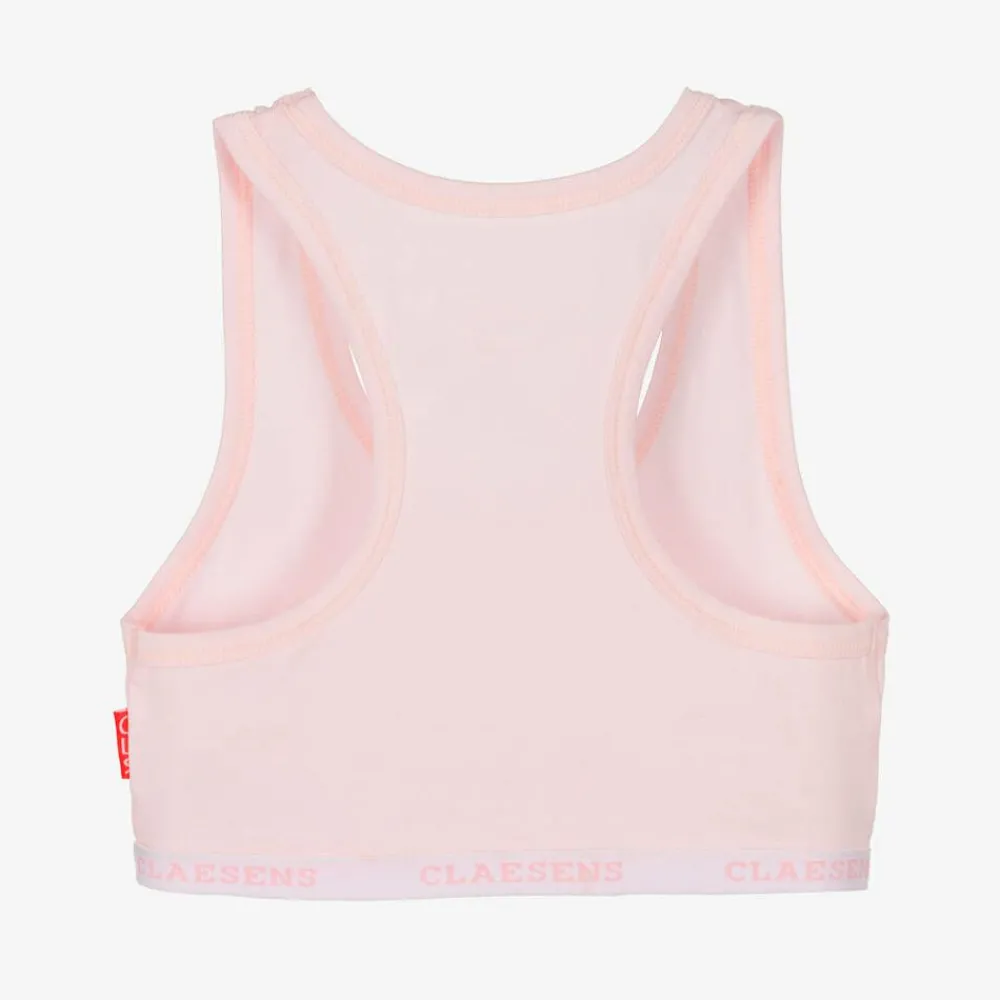 Girls light pink bra top by Dutch brand Claesen's, made in soft and stretchy cotton jersey. It has a sporty racerback and an elasticated logo band for extra comfort.