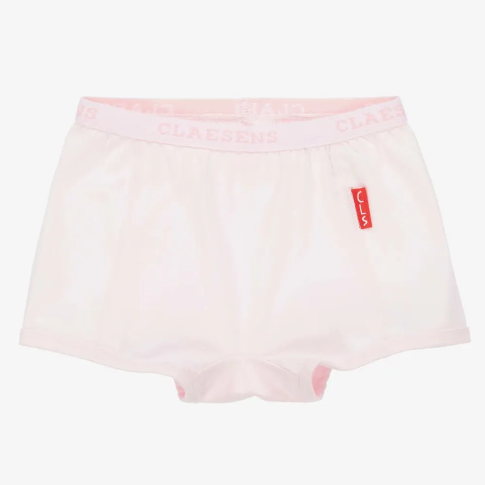 Pack of two pale pink boxer-style knickers for girls by Claesen's, made in soft and stretchy cotton jersey. Comfortable and easy to wear, they have a tonal logo branded waistband.
