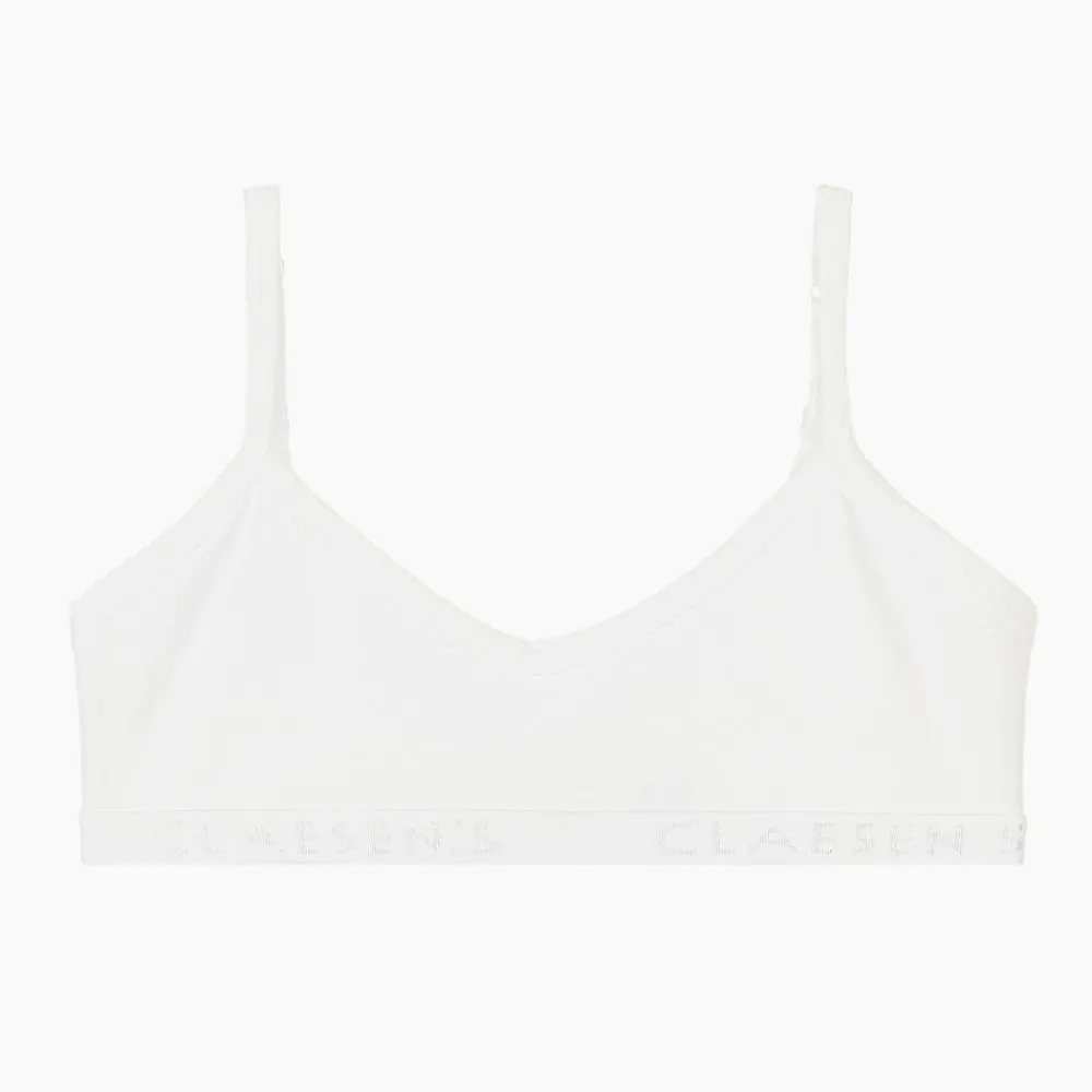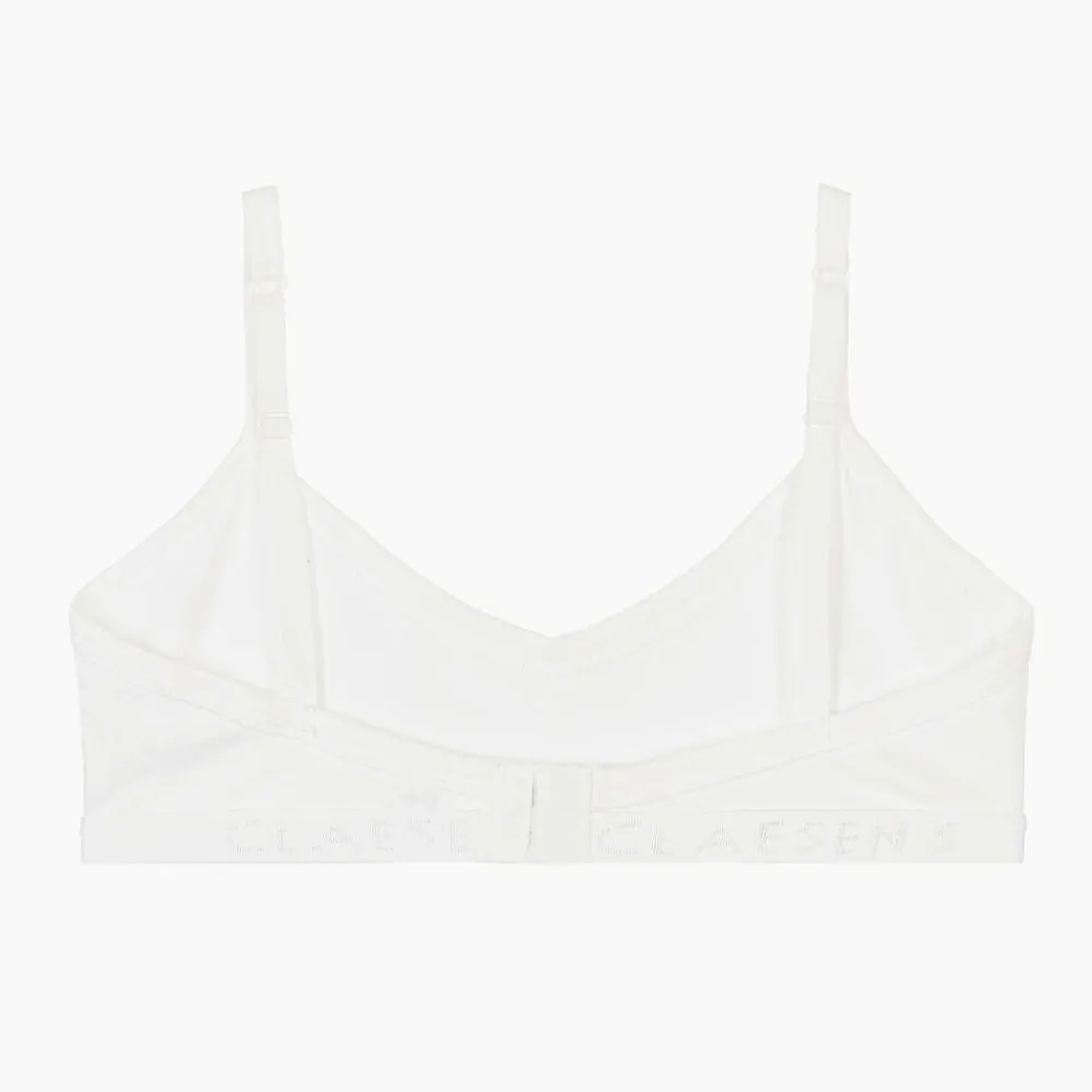 Girls white bra by Dutch brand Claesen's, made in soft and stretchy cotton jersey. It has adjustable shoulder straps and an elasticated band underneath for extra comfort. The straps fasten on the back with hook and eye closures for a secure fit.
