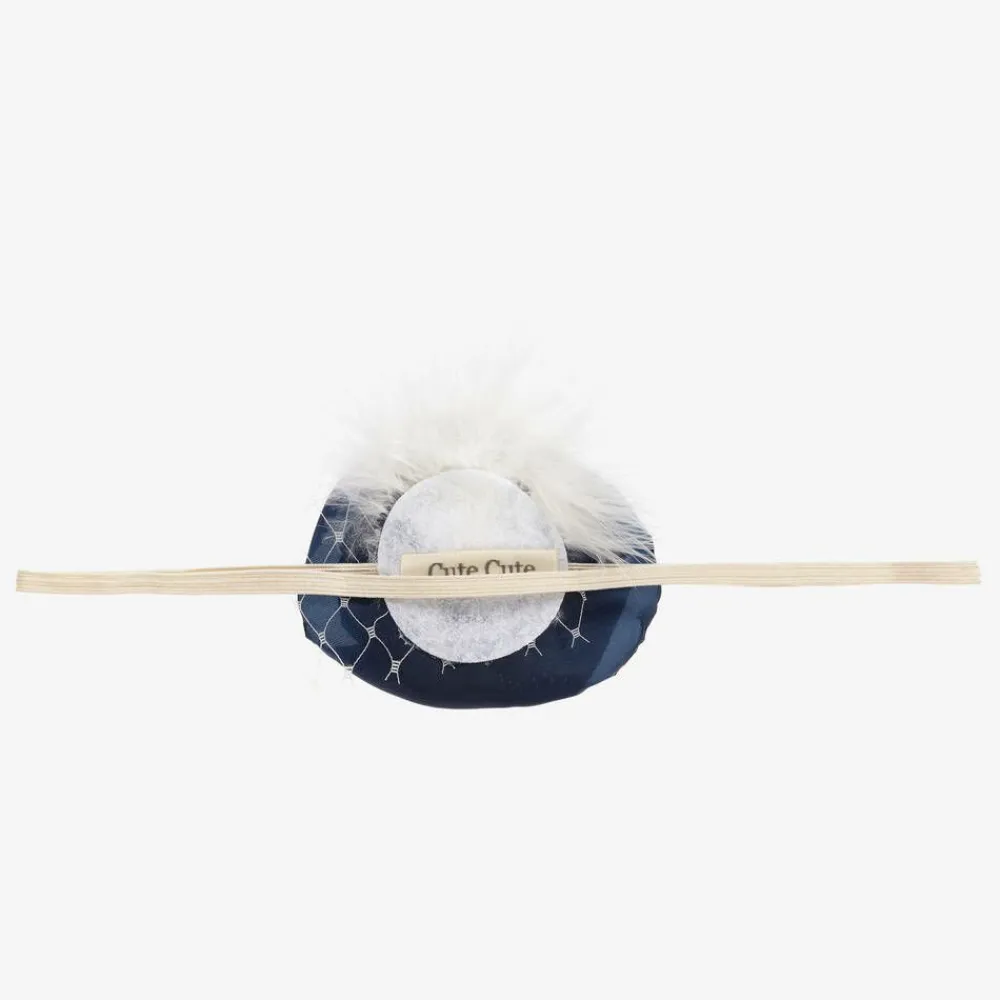 Cute Cute girls navy blue satin rose headband. It is topped with a delicate pearl and diamanté decorated with feather and soft tulle. The soft elastic headband is lovingly handmade in the UK.