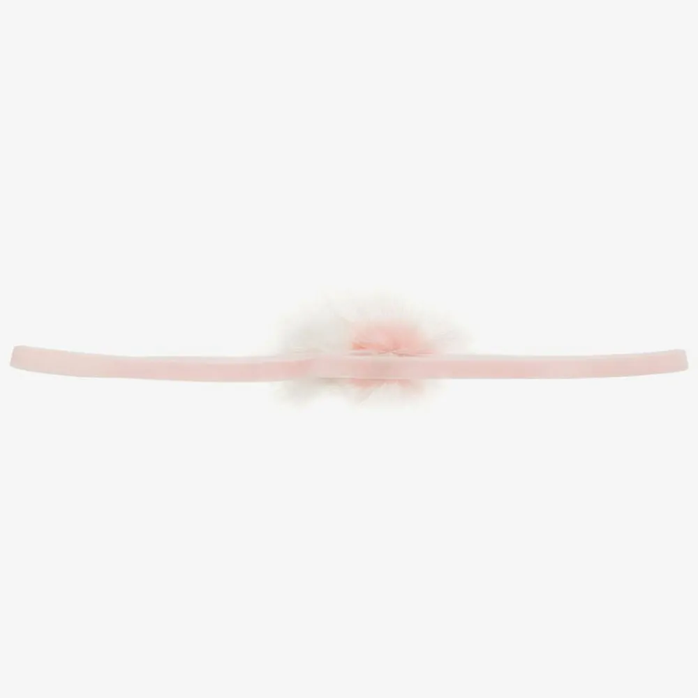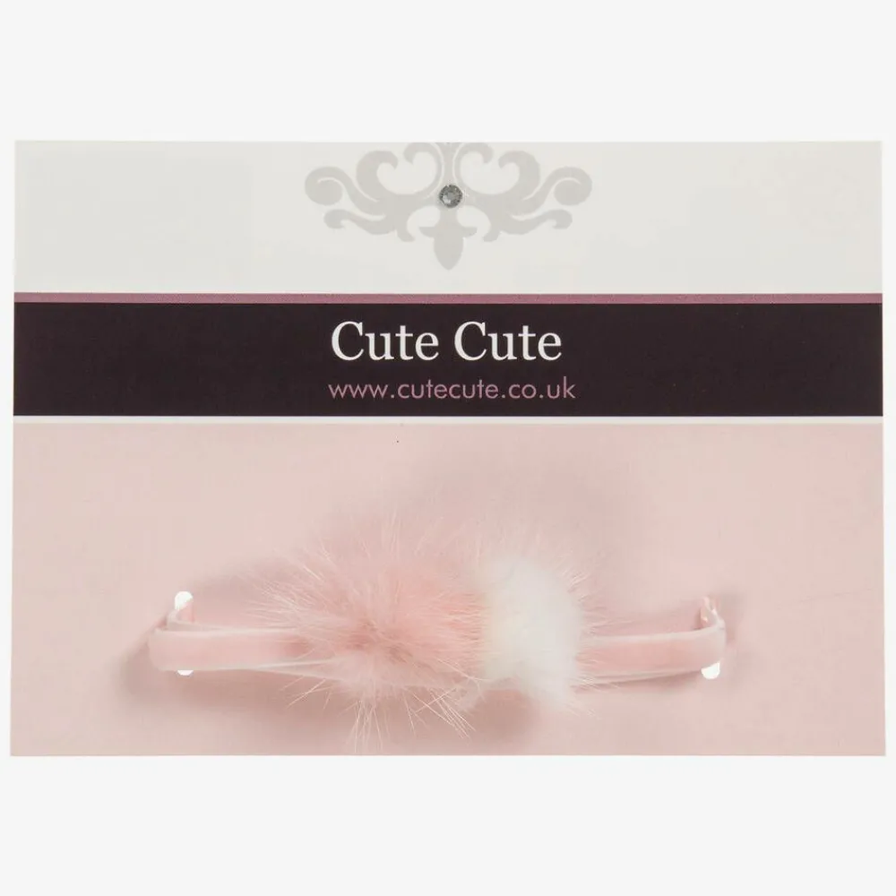 Baby girls pink, stretch velvet headband by Cute Cute, with pink and white faux fur pom-poms.