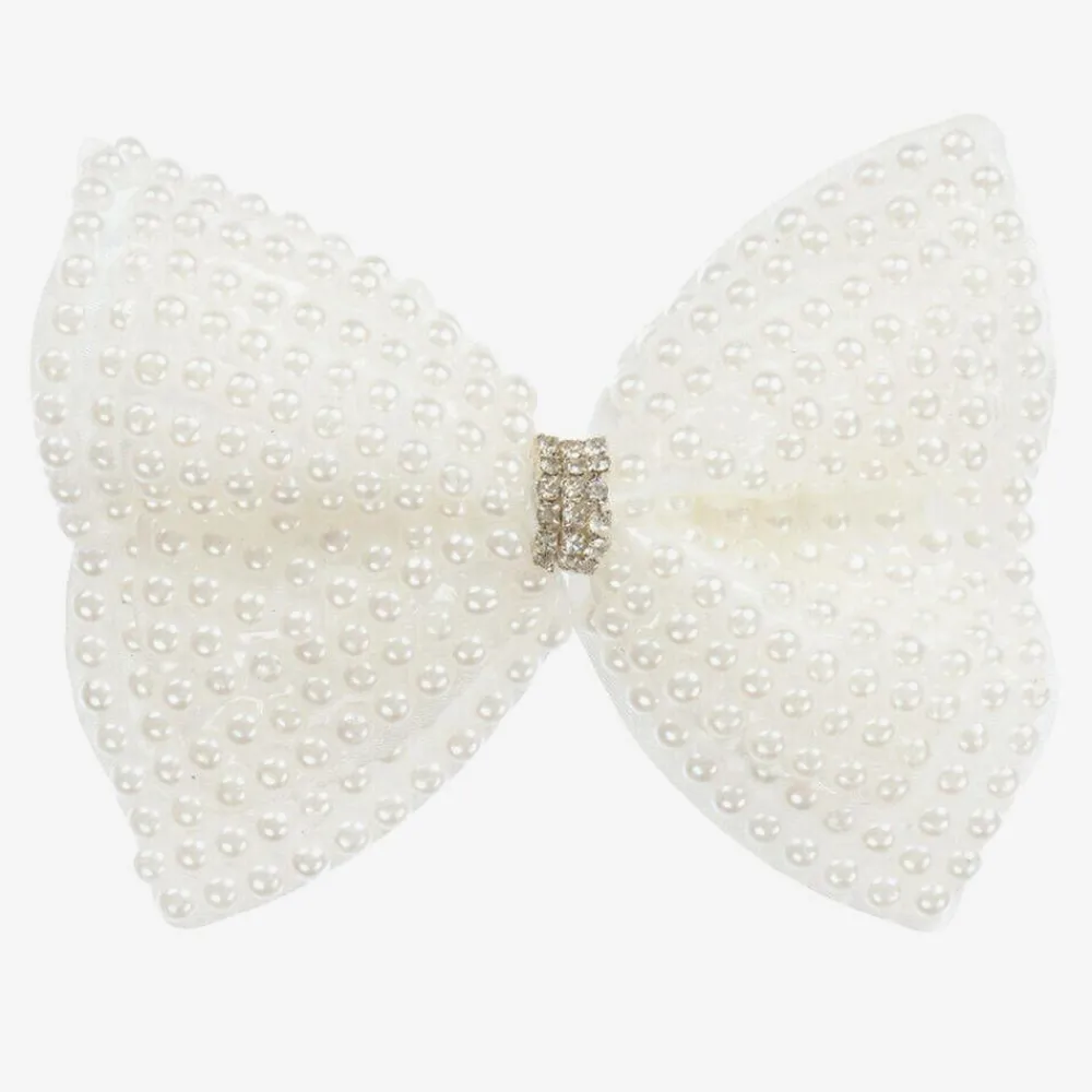 A pretty ivory pearl beaded hair clip by Cute Cute. Shaped into a bow, the centre is studded with sparkly diamantés. There is a crocodile clip fastening on the back.