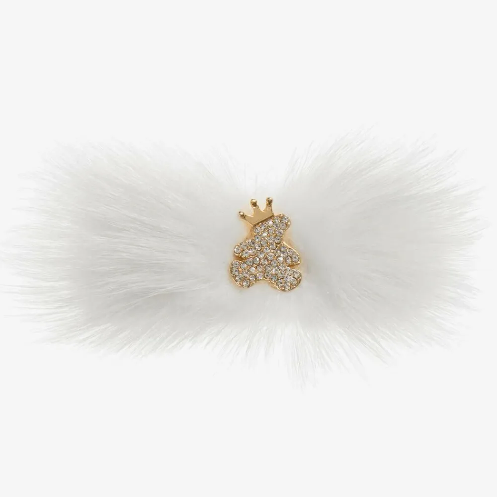 An adorable handmade hair clip by British brand Cute Cute, with gorgeous ivory faux fur and a sweet little diamanté teddy bear. Gentle on the hair the metal clip is covered in soft grosgrain ribbon.