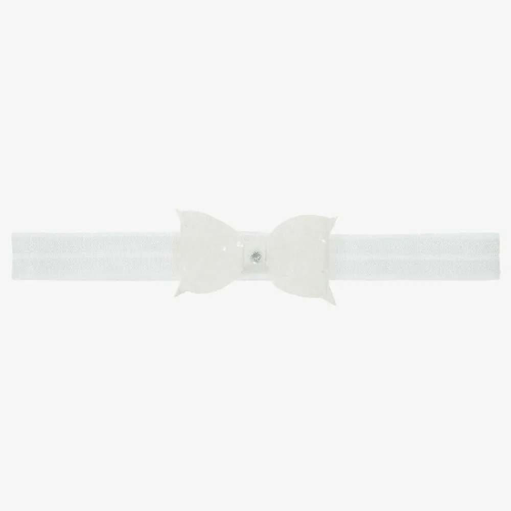 Lovingly handmade, this white headband by Cute Cute is elasticated and soft. It has a pretty glitter bow with a small diamanté at its centre.