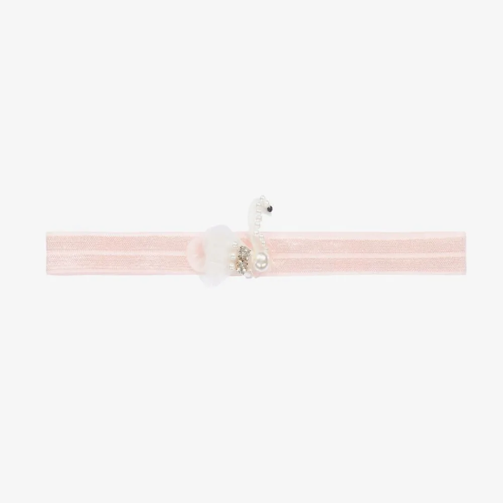 An adorable handmade white headband by Cute Cute, with a pretty white felt swan embellished with beads and gems. Made to fit girls of all ages it has a pink, stretchy elasticated band.