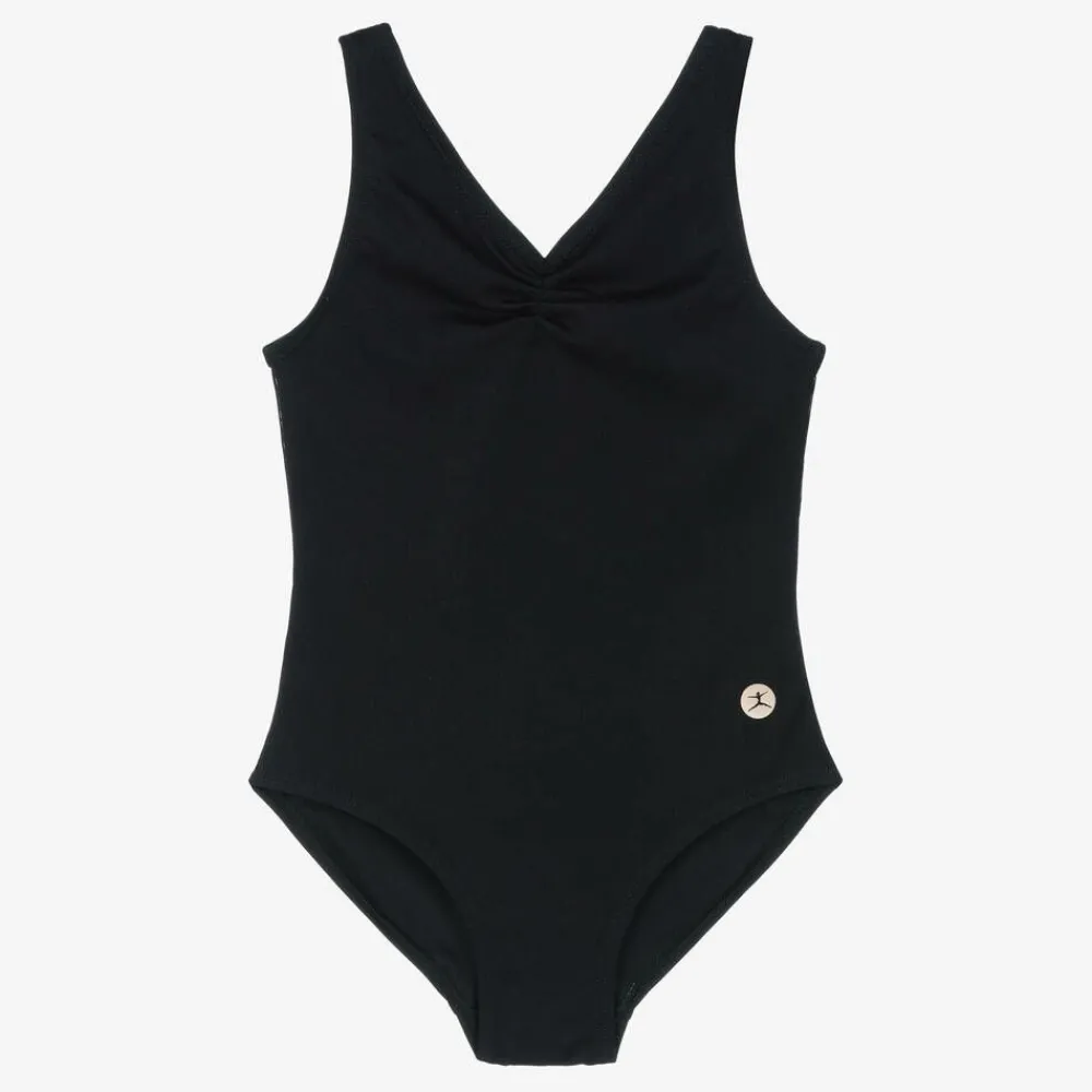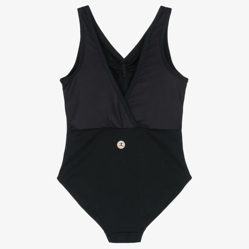 Black leotard bodysuit for girls by dancewear brand, Danskin. Made using the designer's super soft four-way stretch fabric for free movement, it has a ruched centre and a mesh cross-over design on the back. It is comfortable, breathable and also great for yoga and exercise. Rose gold logo prints complete the style with a branded touch.