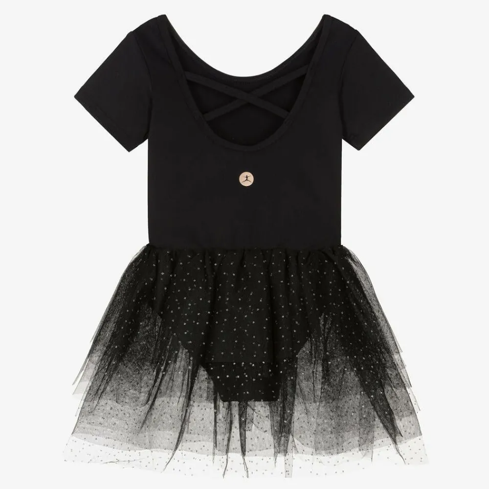 Black tutu dress for girls by dancewear brand, Danskin, made from a super soft and stretchy fabric allowing free and easy movement. Ideal for ballet and dance classes, the short sleeved leotard has a scooped back, detailed with slim cross-over straps. Rose gold logo prints add designer appeal. The attached tutu skirt is made from tiered layers of fine tulle, flecked with silver glitter for added sparkle.