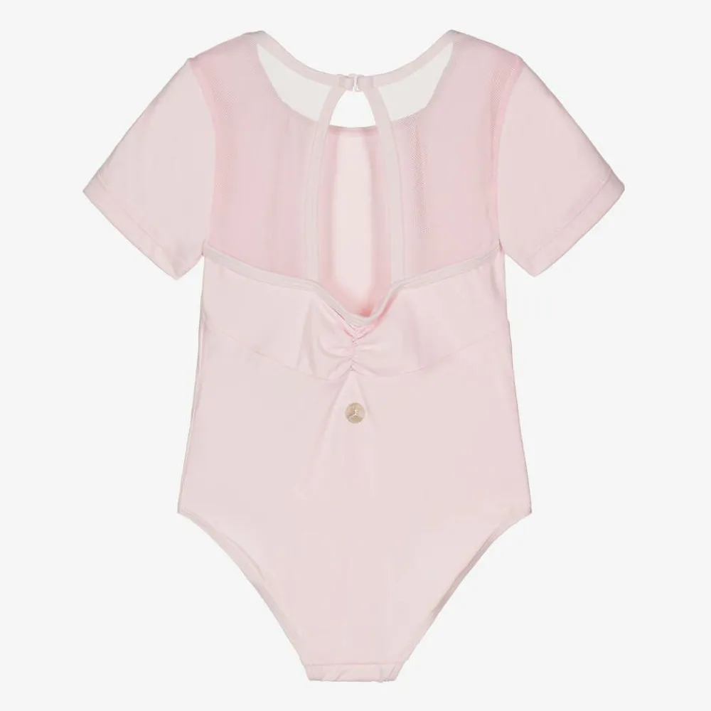 Pale pink leotard for girls by dancewear designer, Danskin. Made using the designer's super soft four-way stretch fabric for free movement, this style is ideal for ballet and dance classes. It has a mesh panel on the back with an open panel and stylish ruching. It is comfortable, breathable and fastens with a clasp on the back of the neck. Rose gold logo prints add a touch of branded shine to the piece.