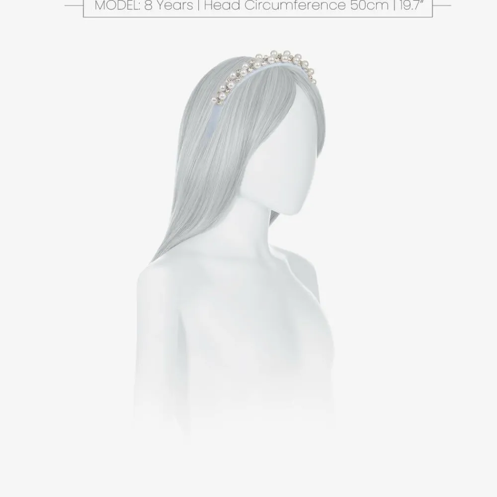 Timelessly stylish blue hairband for girls from David Charles. The flexible band is covered with ivory ribbon and adorned with faux pearls and diamantés for a touch of sparkle.