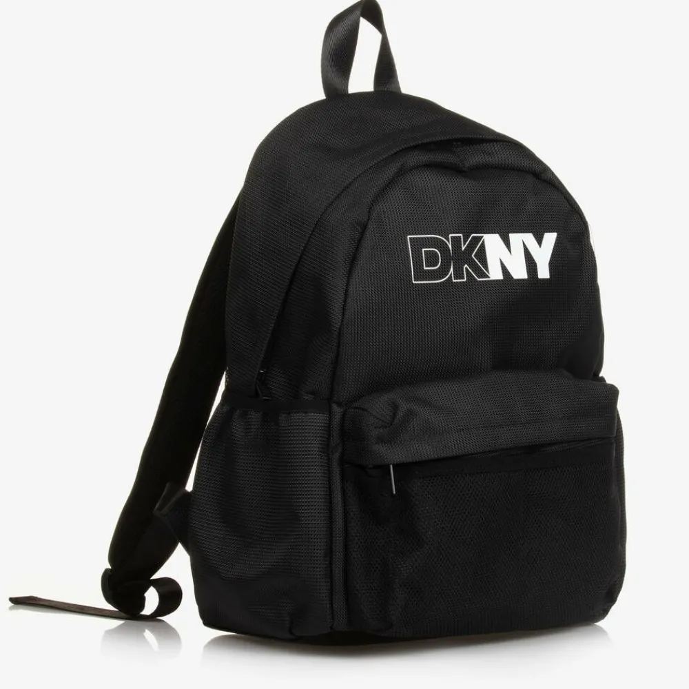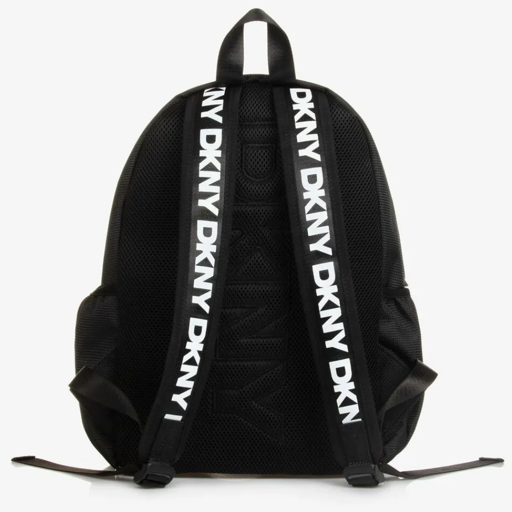 Black backpack for boys and girls by American label DKNY, made in textured canvas for durability. Super stylish and practical, this zip-up bag has bright white logo graphics and multiple inner and outer pockets, some made in mesh, for all their essentials. Lined with smooth fabric, it has a top carry handle and a padded, breathable mesh back, with subtle logo embossing for extra designer appeal. The shoulder straps are adjustable and padded for comfort.