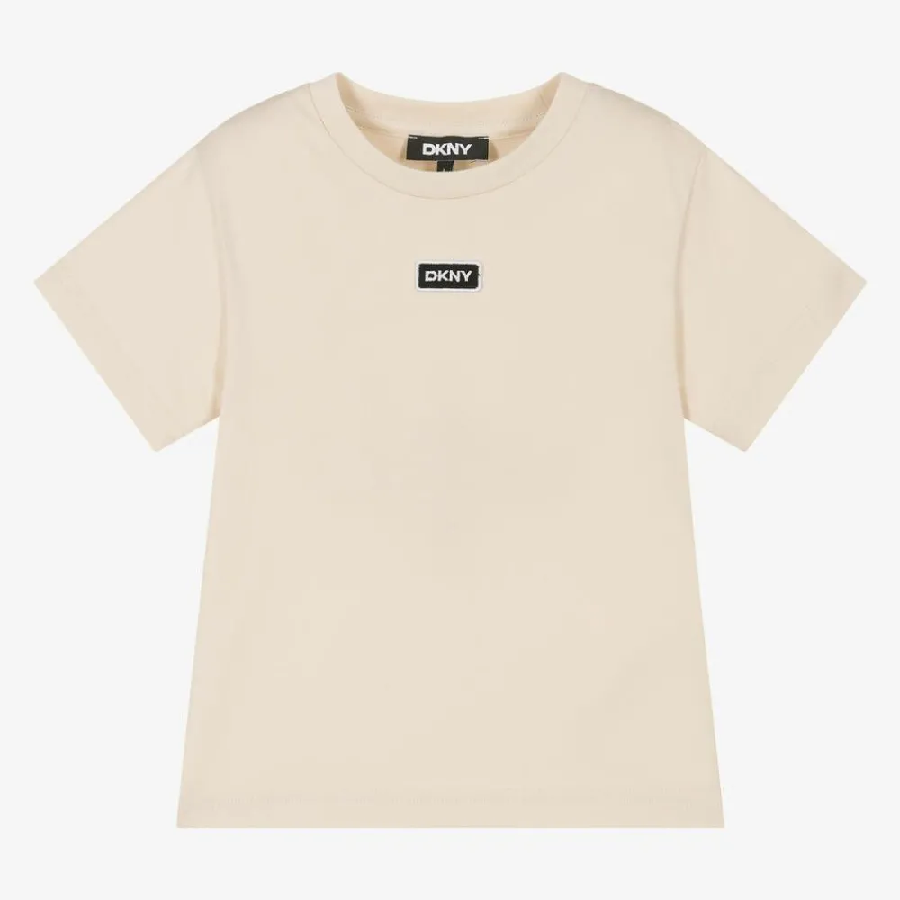 Beige T-shirt for boys and girls by DKNY, made in soft and stretchy organic cotton jersey. For a striking designer statement, it has a large black logo on the back edged with white embroidery. There is a smaller black and white appliqué logo patch on the front.