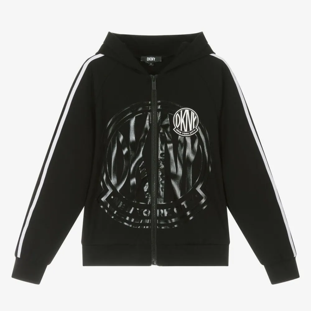 In DKNY's signature black with white trim, this hooded zip-up top is designed for both boys and girls. Made in luxurious Milano jersey, it has a tonal, shiny logo print on the front with a smaller, matching rubberised motif on the chest in white. There are useful side seam pockets and the front zip fastening has a branded pull tab to complete the look.