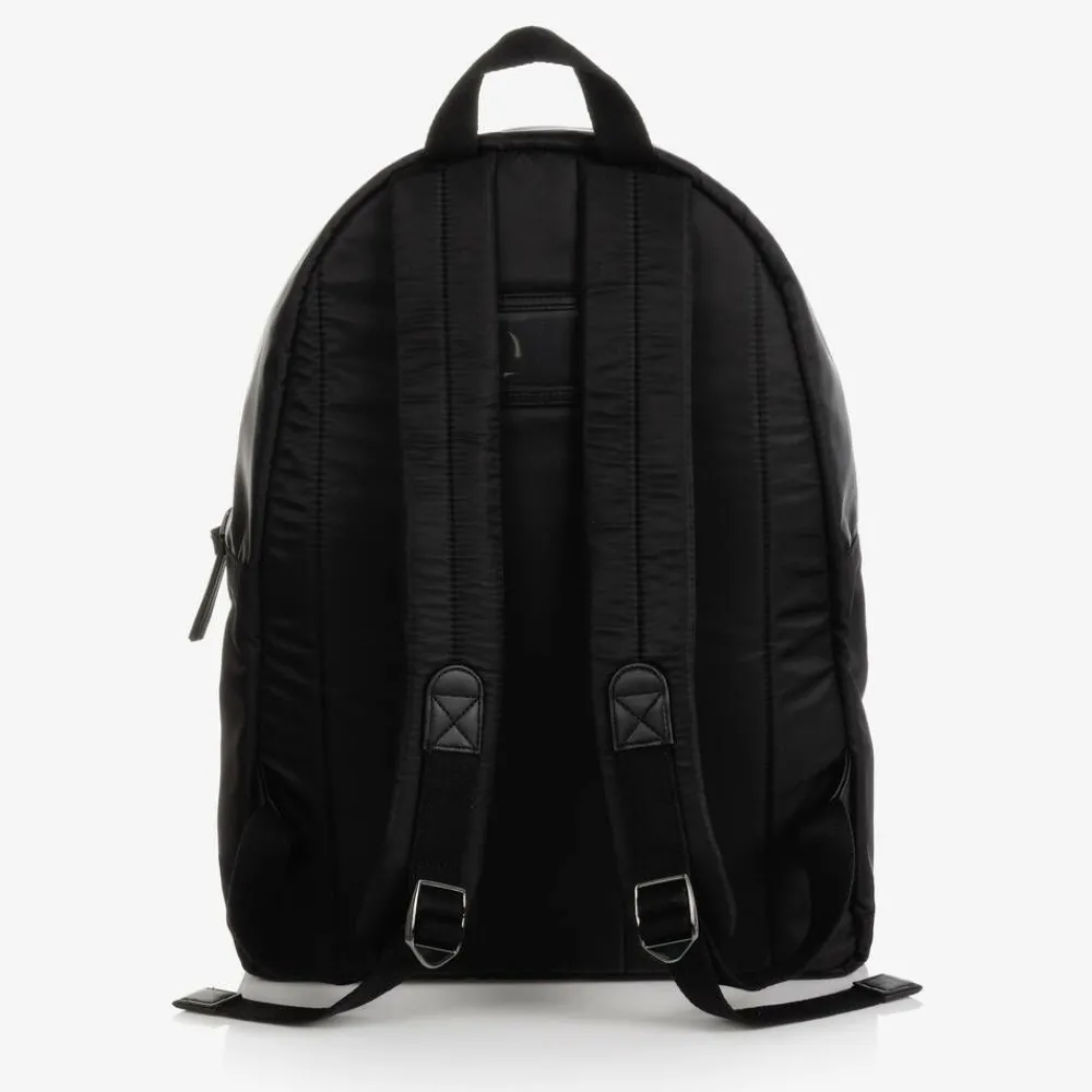 Black backpack from luxury brand Dolce & Gabbana, with stylish pewter hardware. Made in smooth nylon, there is a front zipped pocket for everyday essentials and a roomy main compartment with white logo branding. There is a useful carry handle and adjustable padded shoulder straps for a comfortable fit. A handy nameplate can be found on the back.
