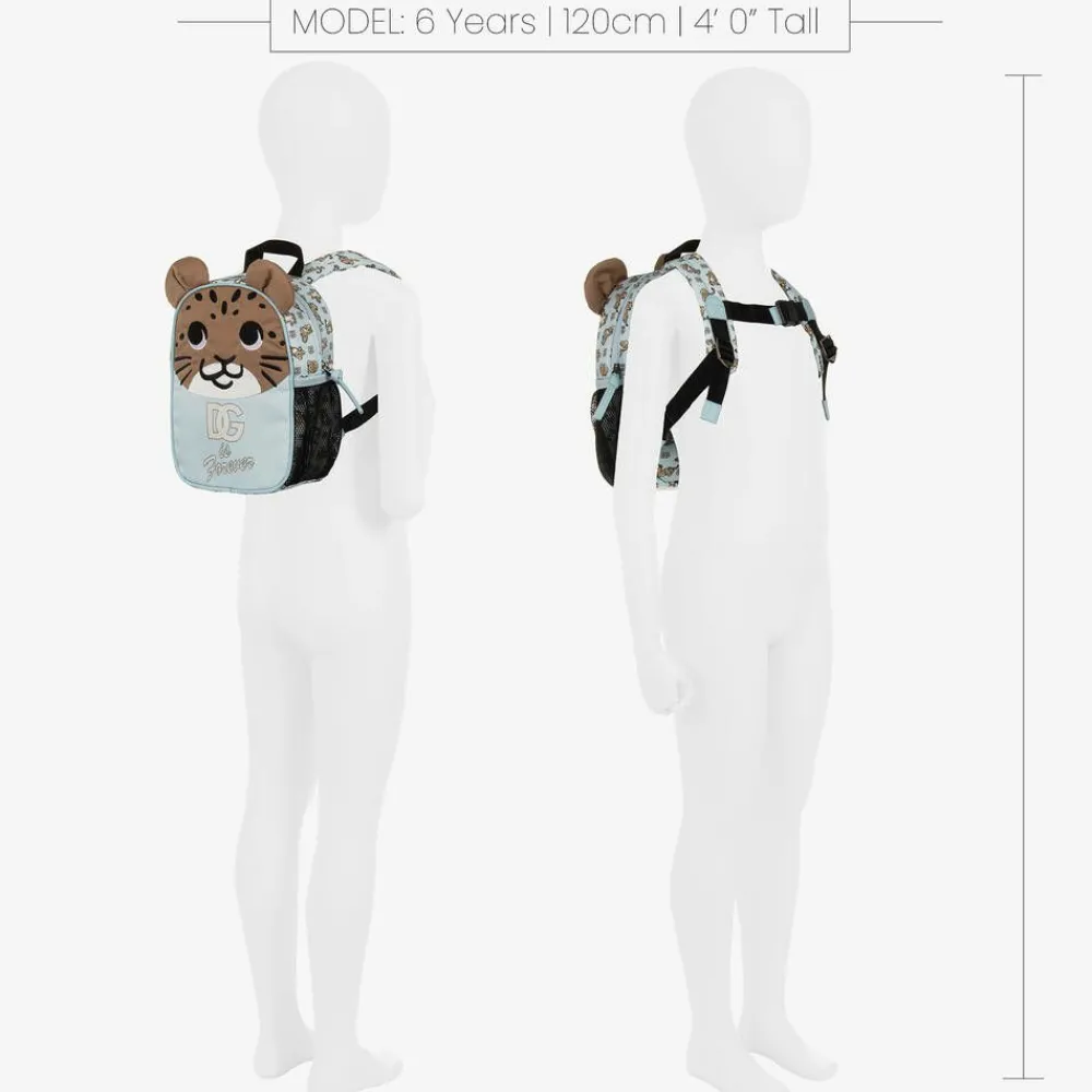 Adorable pale blue backpack for little boys and girls by luxury Italian fashion house Dolce & Gabbana. Made and lined in silky canvas with faux leather trim, this mini style is patterned all over with cute leopards and crossover DG logos. Detailed with little 3D ears, the front has a lovely embroidered leopard face with 'DG is Forever' printed below. The main compartment fastens with a zip and there is a useful, external mesh pocket on one side. The back is padded for comfort and the padded shoulder straps and chest strap are adjustable for a great fit. A small carry handle completes the look.