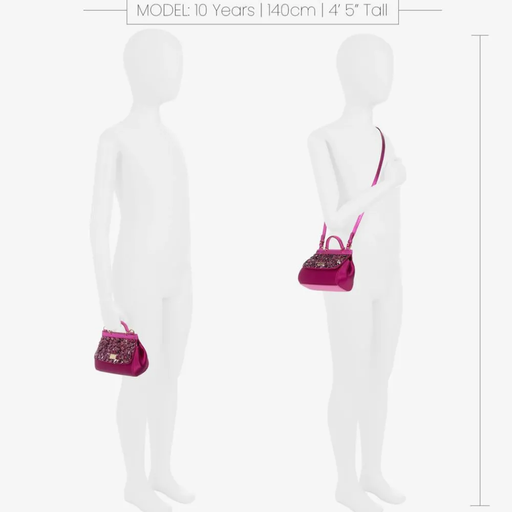 Gorgeous and sparkly for a special occasion, this fuchsia pink satin Sicily bag for girls is by luxury Italian brand, Dolce & Gabbana. This iconic silhouette is meticulously crafted from a sumptuous silk blend satin with metallic leather trims and dazzling rhinestone detailing on the front. A silver and gold tone logo plate adds a signature touch. It can be worn on the shoulder with the adjustable and detachable strap or carried as a handbag with the little top handle. The single compartment secures with a magnetic popper fastening flap.