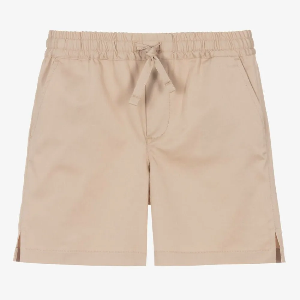 Beige cotton shorts for baby boys by Italian fashion house Dolce & Gabbana, with side pockets and a faux back pocket. The luxury brand has styled these signature shorts with a brown logo label on the back for that unmistakably designer look. These comfortable shorts are made in soft, slight-stretch twill and designed with an elasticated, drawstring waist for no-fuss changing.