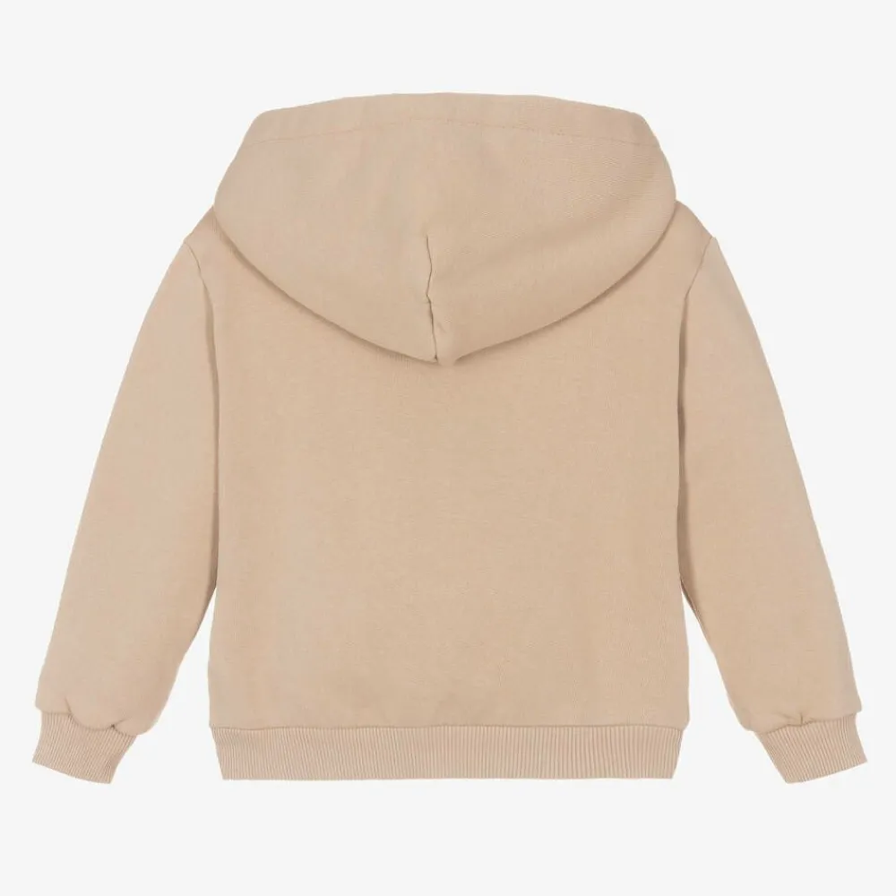 Beige zip-up top for baby boys by luxury fashion designer Dolce & Gabbana, with faux pockets. In consideration of delicate skin, this long-sleeved layer is made in soft, mid-weight cotton jersey. The brand's crest-style DG logo features on the front in tonal print, adding that all-important designer touch. The smooth front zip is engraved with branding and the hood is lined.