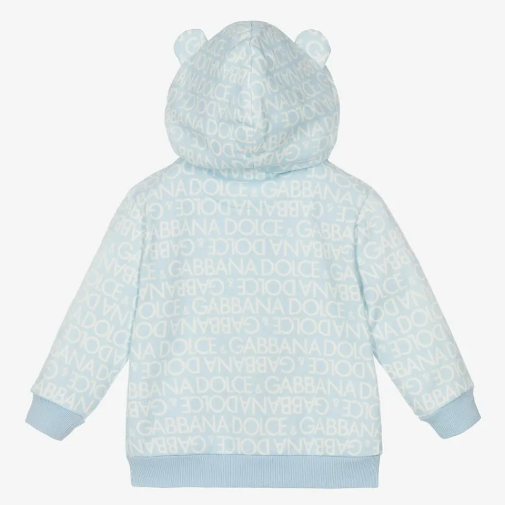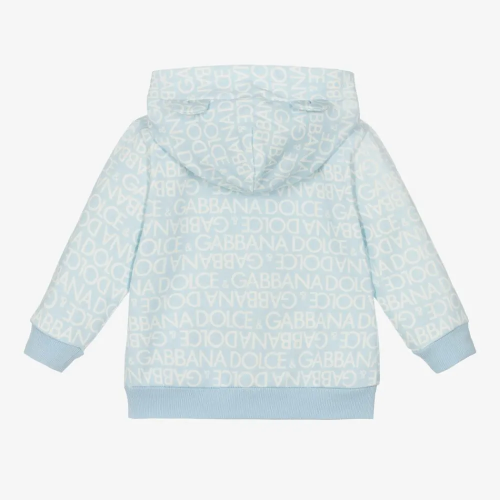 Younger boys pale blue and white zip-up top by luxury designer Dolce & Gabbana, made in soft jersey. Patterned with a bold logo design, this cute top has a sweet leopard motif appliquéd on the chest and gently ribbed trims for comfort. Long-sleeved, it fastens with a branded zip on the front and has a large jersey-lined hood, cosy for little ones.