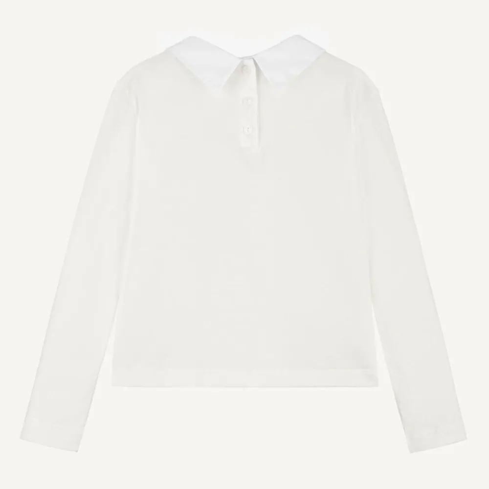 White long-sleeved top for girls by luxury Italian brand Dolce & Gabbana, made in soft cotton jersey. Simple but stylish, it has a collar with a sweet navy blue and red grosgrain ribbon bow on the front. For a subtle designer touch, it has a red embroidered logo on the chest. Comfortable and easy to wear, it fastens with branded buttons on the back.