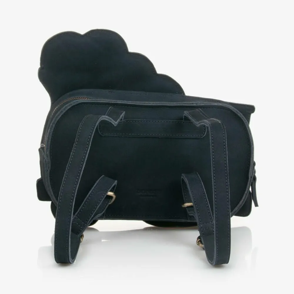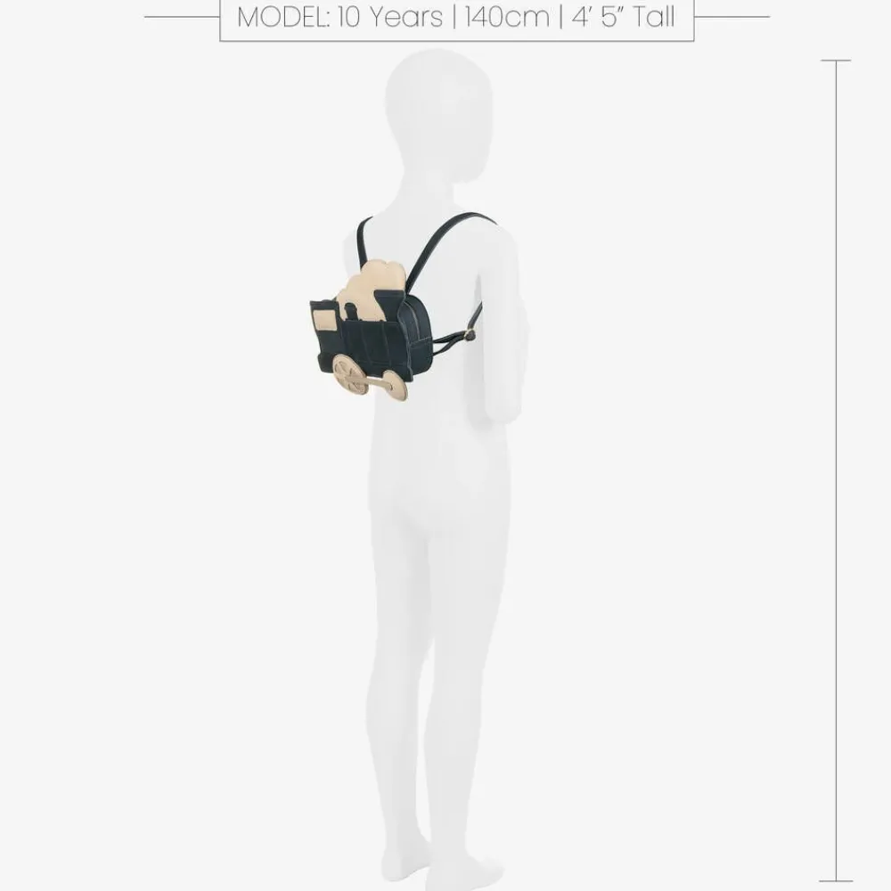 Super cute navy blue back pack for boys and girls by Dutch brand Donsje, in the shape of a steam train. Made in soft suede with adjustable shoulder straps, it has beige leather trims.The small, internal compartment is lined in cotton blend twill and fastens with a zip. There is an embossed logo on the back.