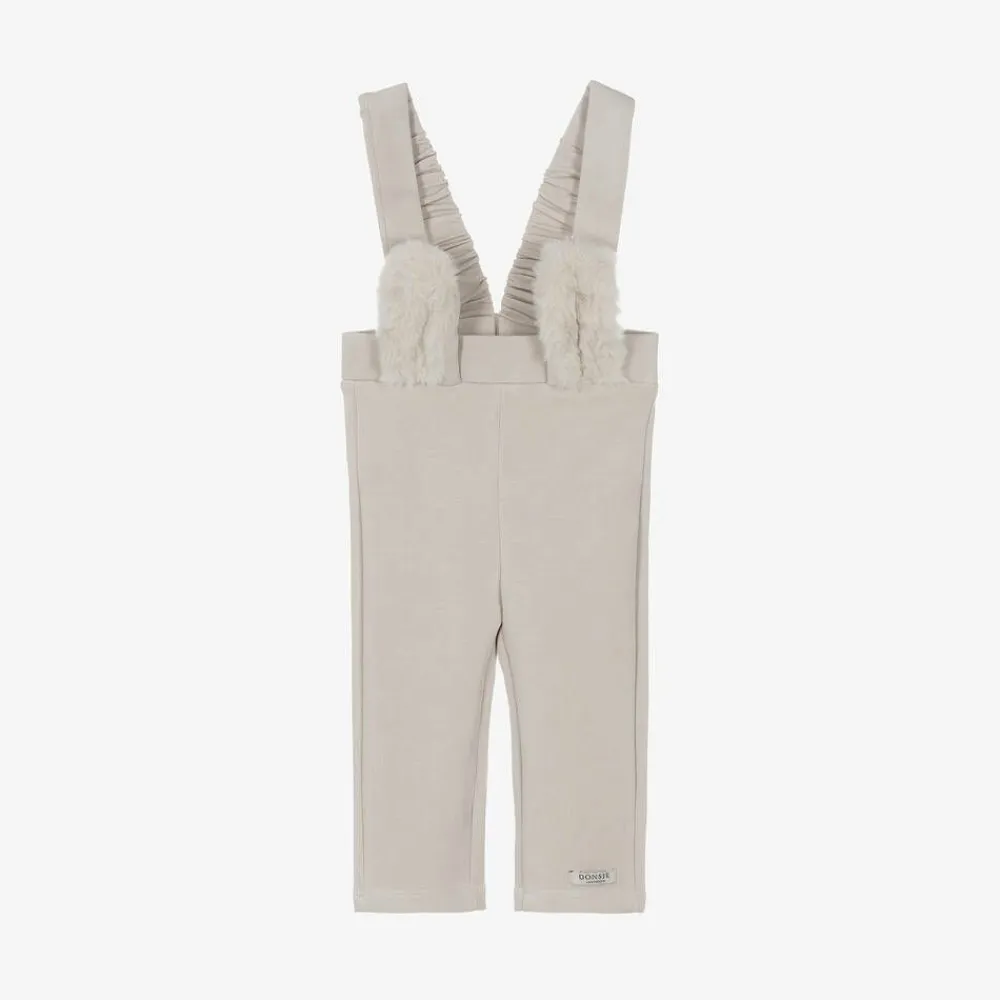 Adorable beige leggings for baby boys and girls by Dutch brand Donsje, made in luxuriously soft modal-blend jersey. Easy to pull on, they come with attached shoulder straps and have cute faux fur rabbit ears on the front. There is an embroidered logo tab on one ankle to complete the look.
