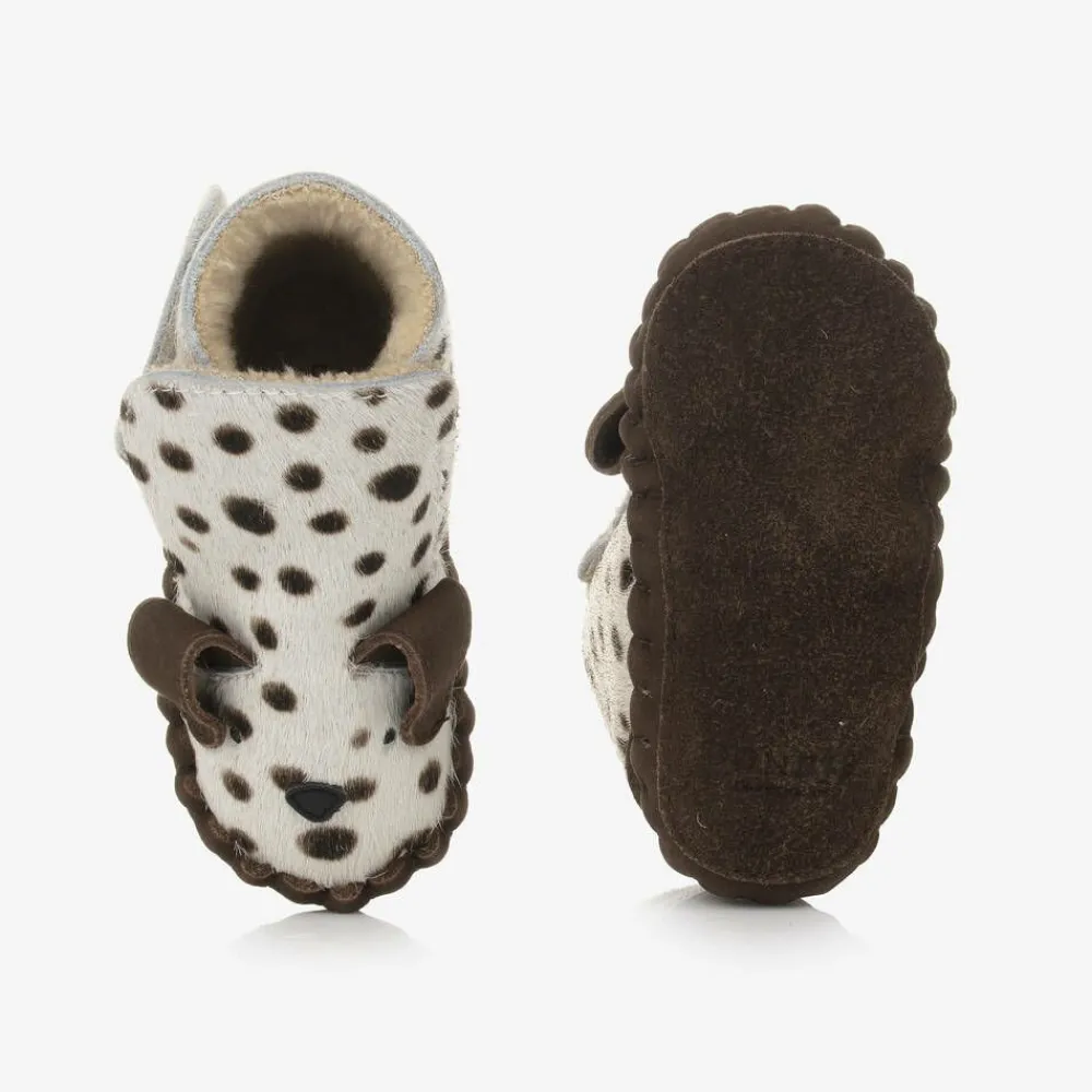 Cute ivory and brown leather pre-walker boots for baby boys and girls from Dutch brand Donsje. Designed as a cute Dalmatian dog with spotty fur, they have embroidered facial features on the front and sweet appliqué ears. They are lined in soft faux fur for comfort and warmth and have a velcro strap fastening on one side for a secure fit. The smaller sizes have a soft, suede leather sole, whilst the larger sizes have a flexible rubber sole, idea for taking those first steps.