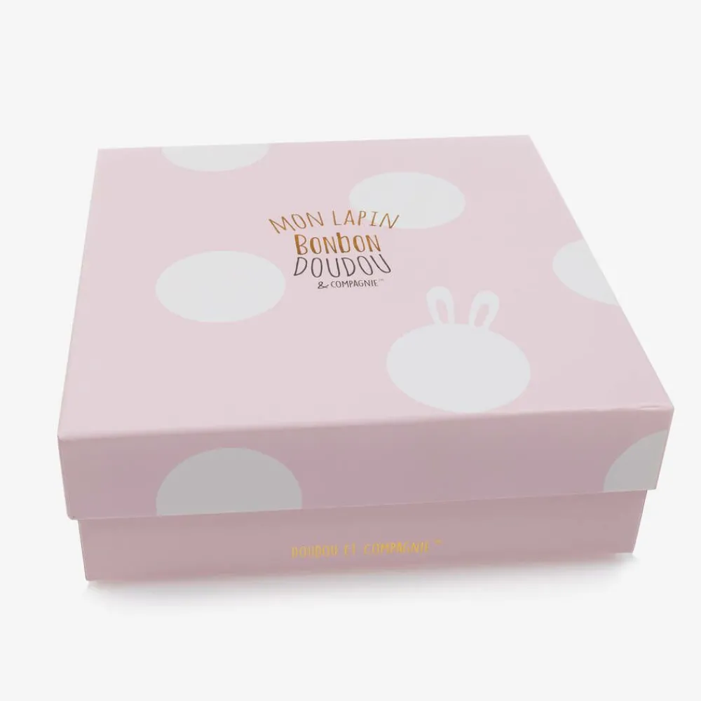 Adorable ivory and pink doudou for baby girls by Doudou et Compagnie, in the shape of a sweet bunny. It is crafted in beautifully soft plush faux fur and has long, floppy ears, making it ideal for tiny hands to grip. Presented in a box, it makes a lovely gift for a special little one.